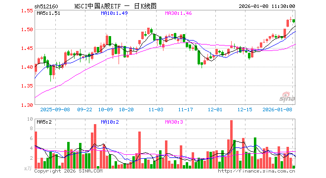 1月8日,截止午间收盘,MSCI中国A股ETF(512160)跌0.52%,报1.517元,成交额69.89万元。MSCI中国A股ETF(512160)重仓股方面,贵州茅台截止午盘跌0.90%,宁德时代跌0.12%,工业富联跌1.65%,招商银行跌1.33%,长江电力涨0.07%,紫金矿业跌0.54%,中国平安跌2.42%,比亚迪跌0.83%,海光信息涨10.65%,寒武纪涨4.66%。