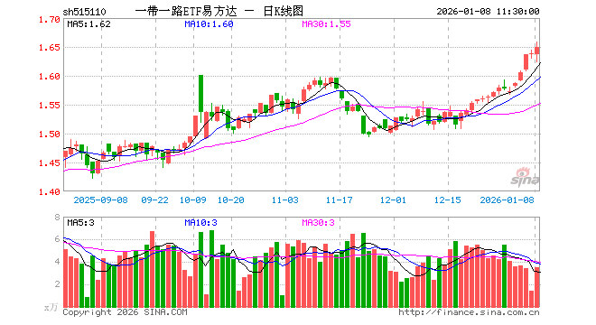 1月8日,截止午间收盘,一带一路ETF易方达(515110)涨0.67%,报1.649元,成交额570.93万元。一带一路ETF易方达(515110)重仓股方面,平高电气截止午盘涨1.94%,山东黄金涨0.49%,紫金矿业跌0.54%,中远海控跌0.60%,广东宏大涨8.04%,中国铝业跌0.78%,小商品城跌0.56%,中远海发涨0.40%,中海油服涨0.14%,云铝股份涨0.12%。