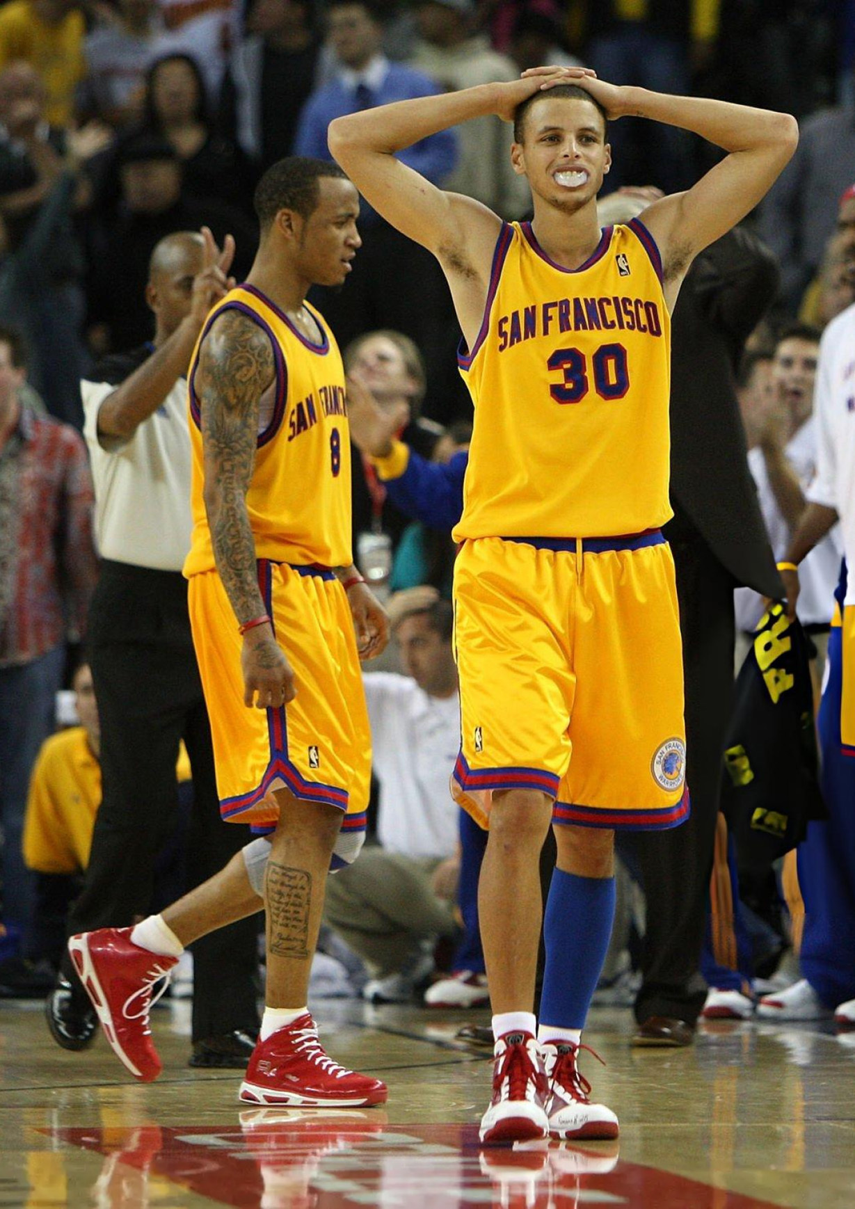 斯蒂芬·库里今天的“入场鞋”是当年勇士当家蒙塔·埃利斯的AND1太极PE今天勇士比赛的对手是雄鹿,而在2012年3月的一笔交易中,蒙塔·埃利斯也是和乌杜还有夸梅·布朗一起被打包送去了雄鹿,换回了博古特和斯蒂芬·杰克逊。这年头,能在有话题度的情况下自费穿AND1的不多了,而且还是当年自己老大哥的鞋