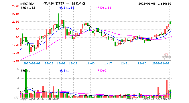 1月8日,截止午间收盘,信息技术ETF(562560)涨0.15%,报1.961元,成交额318.77万元。信息技术ETF(562560)重仓股方面,立讯精密截止午盘跌3.25%,寒武纪涨4.66%,中芯国际涨1.78%,工业富联跌1.65%,海光信息涨10.65%,北方华创跌1.94%,澜起科技跌0.82%,中科曙光涨4.96%,胜宏科技跌2.58%,京东方A涨0.00%。