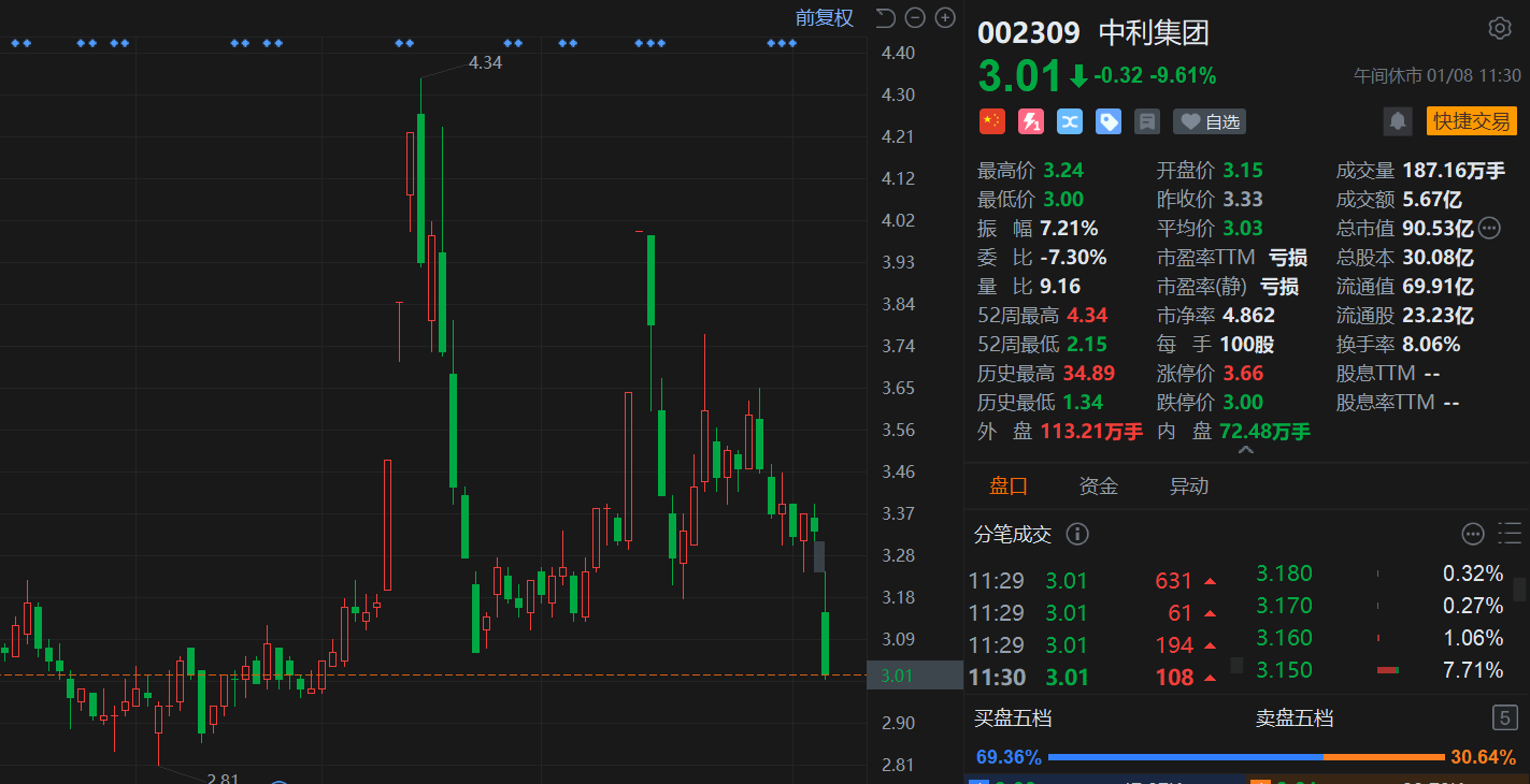 格隆汇1月8日|中利集团(002309.SZ)午间收跌9.6%,盘初几度封跌停,股价险守3元关口,总市值90.5亿元。消息上,中利集团1月5日发布公告称,公司部分限售股即将解禁上市,本次解除限售股份的数量为11.07亿股,占公司发行总股本的36.81%,本次解除限售的股份上市流通日期为2026年1月8日,解禁股类型为其他类型。有分析称,一般而言,限售股解禁后会有一部分股份进入市场流动,供给增加容易导致股价下跌。