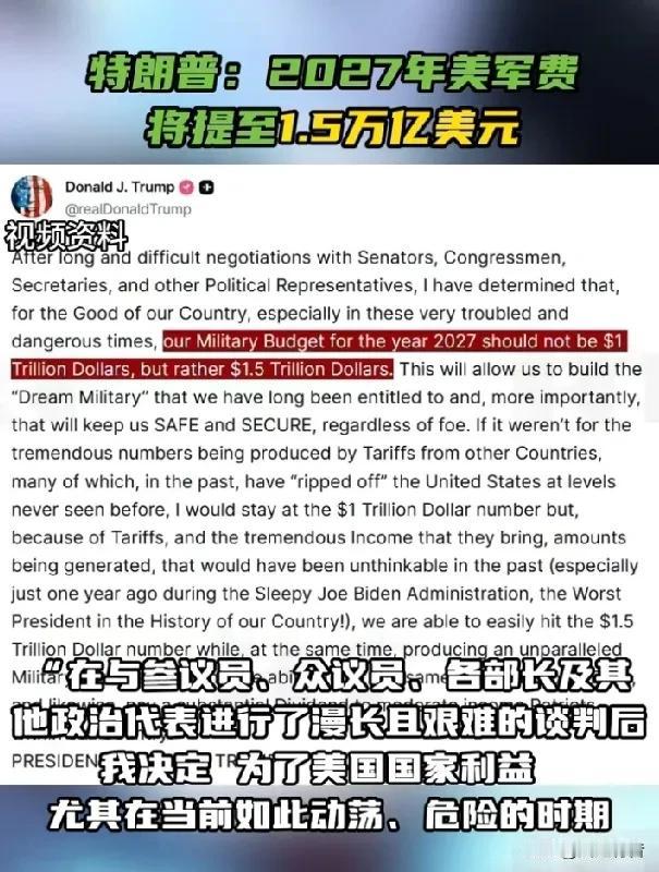 特朗普计划将2027年军费提高到1.5万美元,增长率达50%。 据《今日俄罗斯》报道,当地时间1月7日,美国总统特朗普在其社交媒体“真相社交”发文写到:“在与参议员、众议员、各部长及其他政治代表进行了漫长且艰难的谈判后,我决定,为了美国国家利益,尤其在当前如此动荡、危险的时期,我们2027年的军事预算不应为1万亿美元,而应是1.5万亿美元。” 特朗普声称,美国有信心能够“轻易达成”如此巨额的军事预算,并打造一支“无与伦比的军事力量”,同时还能“偿还国债”,因为“关税带来了巨大的收入”。 俄罗斯科学院近日发布报告指出,2026年美国总统特朗普在对外政策中,仍将主要依靠施压、发出最后通牒和威胁等方式来推动自身目标。 报告认为,特朗普政府的外交政策将继续以“经济利益优先”和“国家安全至上”为核心出发点,因此在对外事务中更倾向于采取强硬、直接的施压手段。 报告同时指出,在必要情况下,特朗普的外交策略也会表现出一定的灵活性。如果某些做法有助于向国内选民展示“外交成果”,其政府可能在强硬立场的基础上调整方式,以取得更有利的政治效果。 特朗普的任期还有三年,余下的时间他还会使用什么手段来实现他的野心?还会给这个世界带来多少动荡?