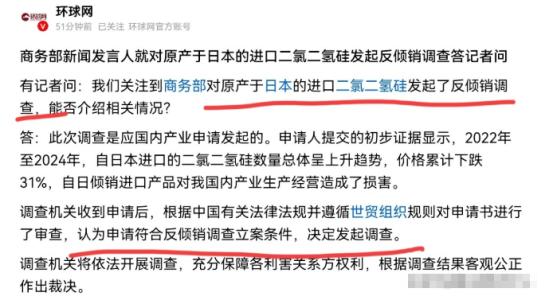 日本还没有回过神来,咱们又一棒子挥过去了!1月7日,我们商务部发布二号令,对原产于日本的进口二氯二氢硅发起了反倾销调查。很显然,我们启动这个调查,这意味着日本的化工材料想要进入中国的市场更加困难了。相关数据显示,二氯二氢硅主要用于芯片制造过程中的薄膜沉积,用于生产逻辑芯片、存储芯片、模拟芯片等芯片。 这东西听着名字绕口,实际是芯片制造里的刚需,纯度要求高到小数点后六位,差一点点杂质,整批芯片都得报废,全球能稳定量产这种高纯度材料的企业,大半都集中在日本。 可能有人不知道,这波操作不是咱们临时起意,而是早有铺垫。就在商务部发令前一天,日本外务省还在对着咱们之前的石墨和镓出口管制抱怨,摆出一副委屈巴巴的样子。 结果没等他们把抗议的话说透,咱们这边反倾销调查的公告就发了,时间卡得准到像提前排好的剧本。当天傍晚日本高官高市早苗出席记者会,脸色凝重得能滴出水来,只说了句“中国这次是动真格的”,再也没了之前强硬的架势。 追溯起来,这事的源头能拉到2025年11月,当时高市早苗在公开演讲里抛出那句“台海有事就是日本有事”,直接踩了咱们的红线。外交部第一时间警告过后,日本不仅没收敛,反而跟着美国对咱们半导体核心材料搞出口管制,尤其是光刻胶、蚀刻液这些关键品类。 咱们没有立刻反击,而是选择冷处理,直到2025年12月,唐山三孚电子材料有限公司代表国内产业提交了反倾销申诉,指控日本企业长期用低价倾销挤压本土企业生存空间。 30天后调查正式立案,这个时间刚好卡在《反倾销条例》规定的最短周期内,每一步都走在规则框架里,让日本想挑错都没地方下手。根据申诉材料和商务部初步审查结果,2022年到2024年这三年里,日本二氯二氢硅对华出口量一个劲涨,价格却累计跌了31%。表面看是咱们买得便宜,实际是日本企业想用低价把咱们刚起步的本土产业打垮,彻底垄断中国市场。 咱们敢这么果断出手,核心是手里有了底牌,不再像以前那样担心被卡脖子。从2023年开始,咱们就在新疆、内蒙古这些地方推进多晶硅扩产计划,到2025年底,相关产能已经占到全球31%,预计2026年还能突破35%。 中芯国际和中化集团还联手攻关高纯电子化学品的本地替代,加上国家级战略储备,短期内咱们能实现六到十二个月的应急供应,完全有缓冲时间。 国内企业也不是吃素的,像三孚股份这样的企业,早就布局了电子级二氯二氢硅的生产,还拿到了安全生产许可证,相关产品已经进入部分芯片制造大厂的产线验证。 虽然在高端制程上还需要进口,但“完全离不开日本货”的时代早就过去了。这次发起调查,刚好趁着国产替代的窗口期,帮本土企业争取更多发展空间,慢慢拿回供应链的主导权。 反观日本这边,日子就没那么好过了。他们的半导体材料企业看着风光,实际对中国市场依赖度高得吓人,东京电子2025年的财报显示,对华营收占比高达42%,信越化学、东京应化这些主打高纯度材料的企业,情况也差不多。中国既是他们最大的买家,也是他们最离不开的市场,现在咱们启动反倾销调查,这些企业的日子立刻紧张起来。 更有意思的是日本应该记得2019年的日韩贸易战,当时他们对韩国断供氟化氢,本想拿捏韩国半导体产业,结果不到半年三星良率就暴跌,韩国政府立刻成立专项办公室推进替代,两年内就基本实现了国产化。 现在角色反转,他们自己被卡了关键材料的出口,想要找到替代市场可比登天难。毕竟全球能消化这么多高纯度二氯二氢硅的,也就只有中国这个芯片生产大国。 这次调查从2026年1月7日开始,按规定通常会在2027年1月7日前结束,特殊情况最多延长半年。调查期间,商务部会通过问卷、抽样、听证会这些方式收集信息,要是日本相关企业不配合,或者不如实提供资料,商务部就会根据现有事实和可获得的最佳信息作出裁定。这意味着日本企业要么老实配合,要么承担更不利的结果,怎么选都头疼。 咱们这波操作不是要搞贸易战,而是用合规的方式维护自身权益,同时推动本土产业升级。以前咱们在高端电子化学品领域总被人卡脖子,现在随着国产技术不断突破,终于有能力跟这些垄断企业掰掰手腕。 日本到现在可能还没完全回过神来,他们没想到咱们反击来得这么快,更没想到咱们的准备这么充分,这一棒子下去,不仅打在了他们的利润点上,更打破了他们在半导体材料领域的垄断幻想。