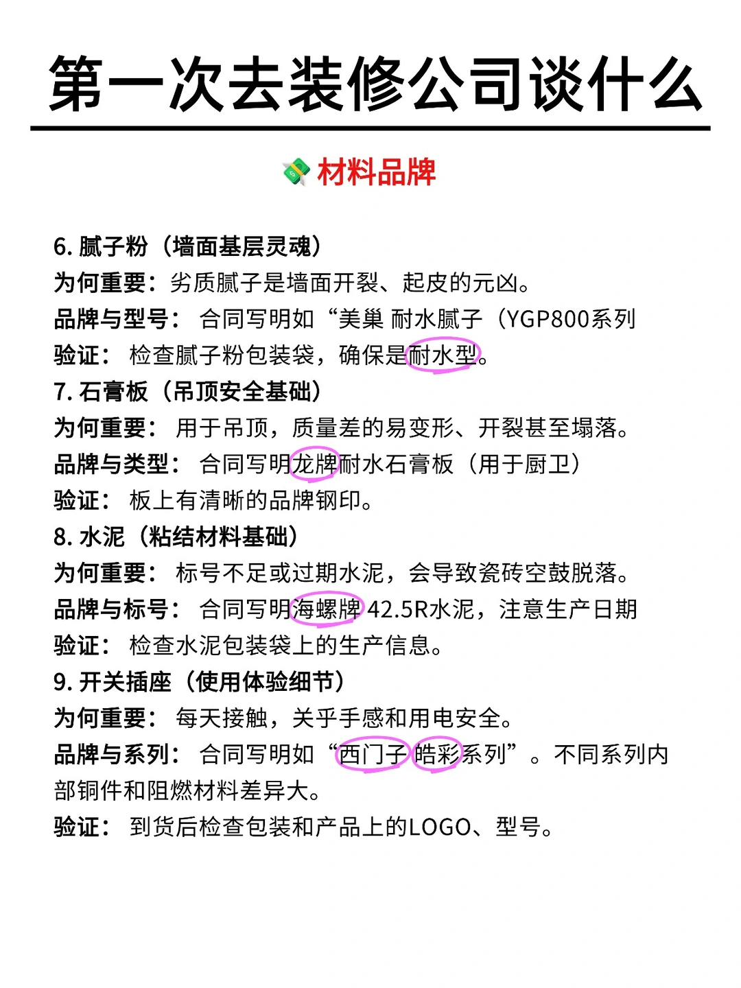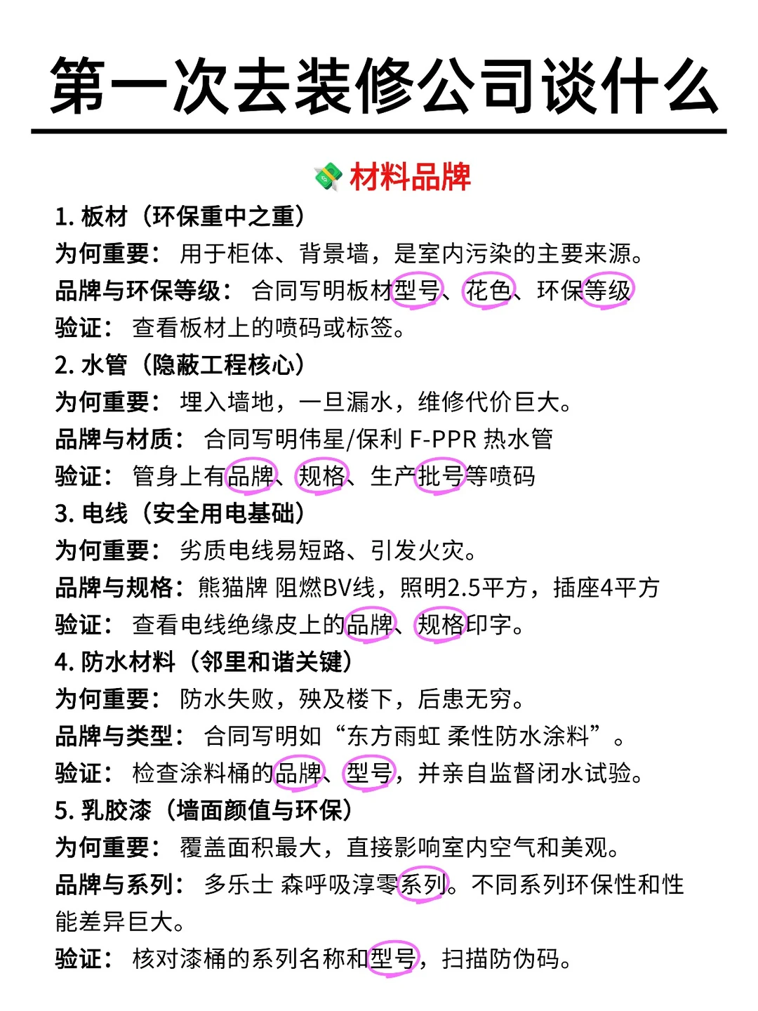 要问: 请写明 水电、乳胶漆、腻子、板材的具体品牌和型号