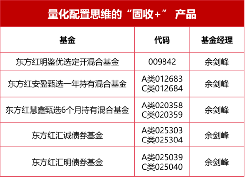 其中,低波固收+以东方红价值精选混合(A/C类:002783/002784)、东方红优质甄选一年持有(A/C类:009725/013785)等为代表,这些产品在固收底仓之上提高权益和可转债配置比例,通过更积极的资产配置在控制风险的基础上争取净值弹性;中波固收+中,东方红汇享债券基金(A/C类:016832/016833)、东方红核心优选定开混合(A/C类:006353/010292)等一批基金独具特色;高波固收+产品中,东方红收益增强债券(A/C类:001862/001863)、东方红配置精选(A/C类:005974/005975)表现亮眼,而在量化配置思维策略领域,基金经理余剑峰借助目标波动率和量化风控,进一步将股债一体化管理推向更精细的层面,丰富固收+的表现形态。