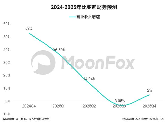 基于比亚迪领先的技术能力和齐全的产品线,虽然国内市场竞争日趋激烈,但极光月狐综合市场数据、自有用户数据综合分析,判断2025年四季度比亚迪营收增速将回归正轨。