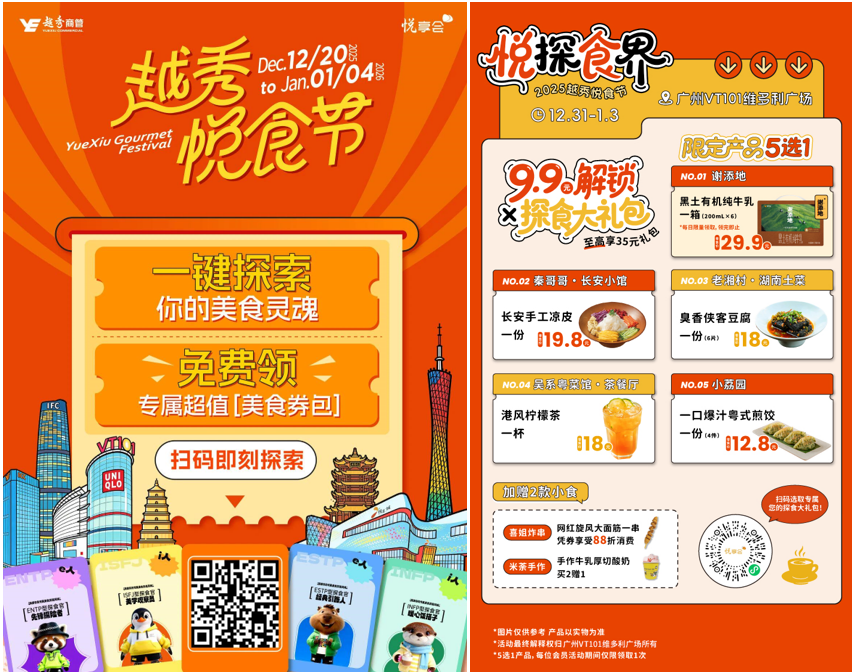 2025年12月20日,越秀商管在延续往期多次活动成功经验、沉淀百万级会员基础的前提下,正式启幕以“悦探食界”为主题的越秀商管悦食节。本届悦食节以“美食为核、多业联动、文化赋能”为理念,创新打造“美食+”多元消费融合场景,于12月20日至2026年1月4日陆续落地广州、佛山、武汉、西安等城市核心商圈,覆盖越秀商管旗下近20座商业体,为各地市民呈上一场集美食品鉴、潮流社交、文化体验、购物狂欢于一体的沉浸式跨年狂欢盛宴,持续点燃冬日消费热情。
