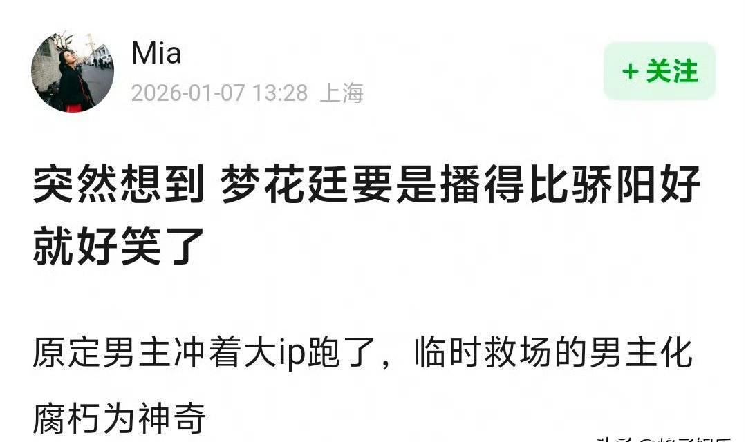 宋威龙跑了。 陈哲远上了。 定档3月15,腾讯独播。 所有人都在夸宋威龙选《骄阳》聪明。 我差点就信了。 看一眼数据:《梦花廷》预约破300万,热度屠榜。 陈哲远是谁? 《偷偷藏不住》里把暗恋演成国民记忆的那个男人。 扛剧? 他字典里没“扑”这个字。 张婧仪的演技是淬过火的。 原著IP的粉丝盘厚得像城墙。 古偶这口饭,天时地利人和,齐了。 反观另一部,现代剧赛道挤成红海。 选角博弈背后是血淋淋的算力比拼。 最新预告刷了三遍。 服化道把钱烧在了刀刃上,不是廉价影楼风。 一个镜头:陈哲远提剑转身,眼里不是霸总冰霜,是苍生的悲悯。 这颗粒度,对了。 所以哪部会爆? 我的硬币押给了被“放弃”的那个。 有时,众人追捧的阳关道,恰恰是最大的认知陷阱。 热闹是他们的,而真理,往往静悄悄藏在被轻视的角落里。 看懂这局的人,早默默点下了预约键。