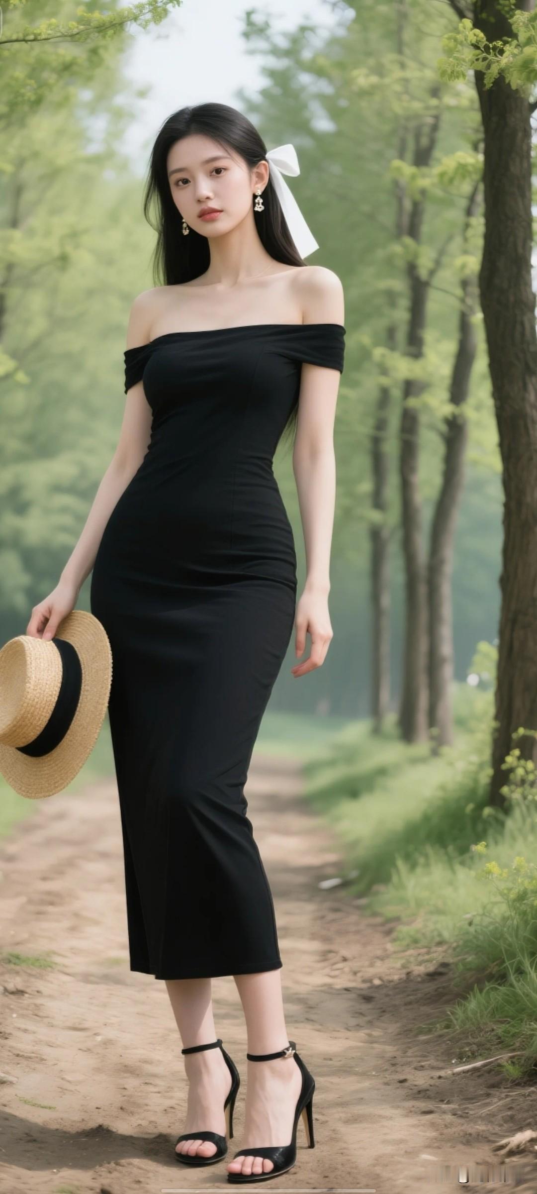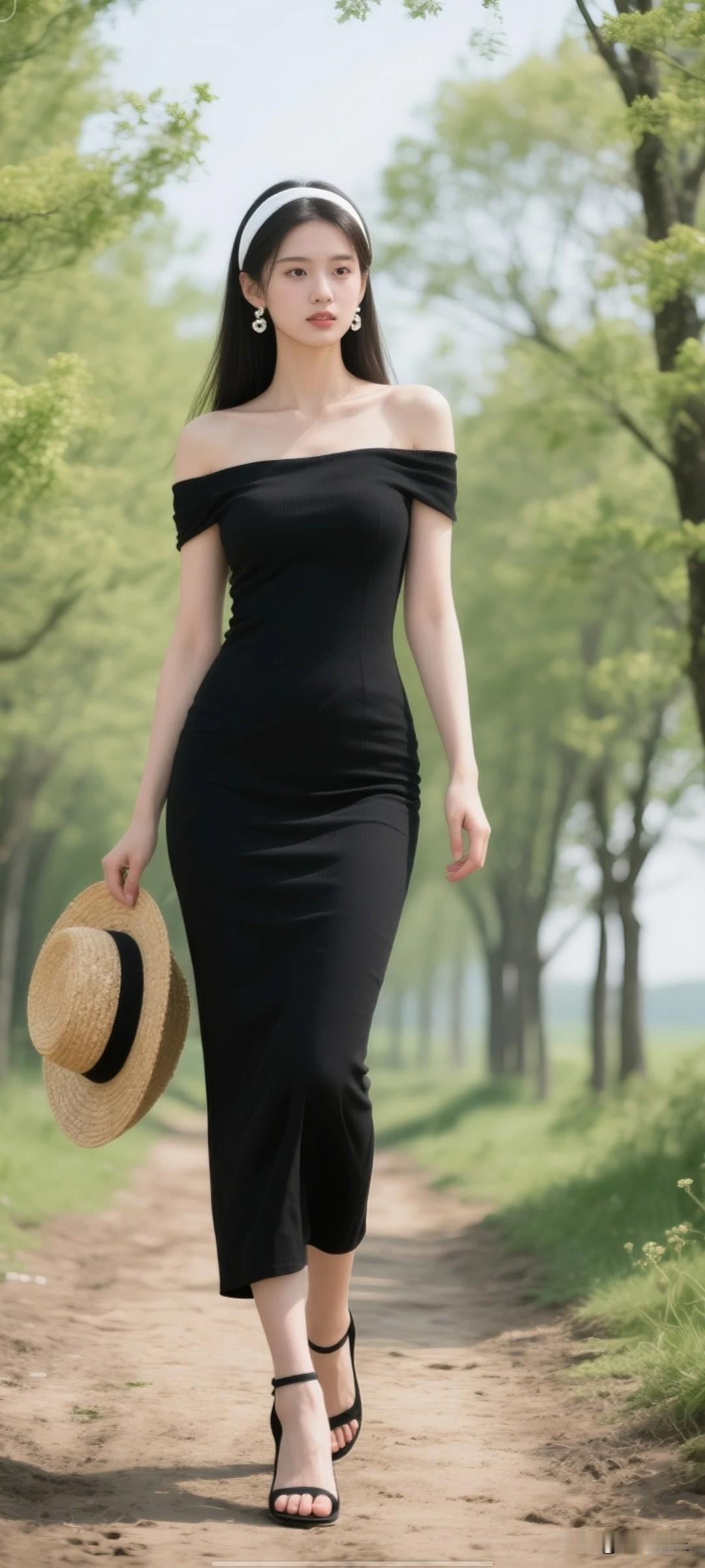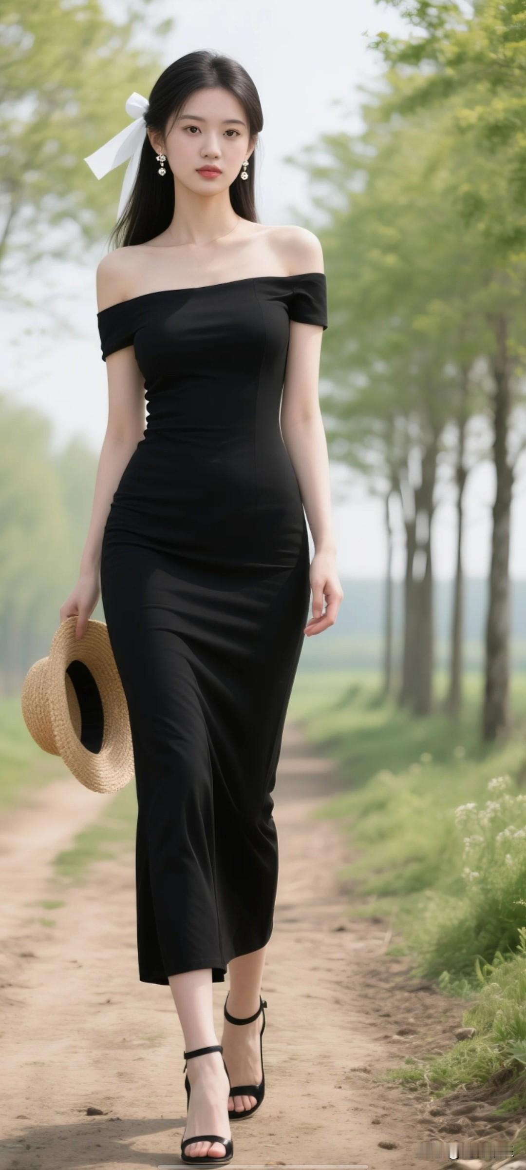 23岁左右年轻女子,175,绝美容颜,上围饱满挺拔,穿黑色一字肩紧身长裙,空乏以凸显身材,黑色高跟凉鞋,黑色的森系发型,手拿草帽,带着羞涩的微表情,背景是乡间泥土小路,路两侧有笔直树木,画面边缘有绿色点缀,春日氛围,氛围感。高清,细节,画面丰富,东方美女,冷白皮气质美女,纯欲风,皮肤白皙,千金大小姐气质,佩戴简约精美耳饰,东方美女,冷艳美人,完美轮廓脸型,低角度仰拍,柳叶细眉,水汪汪大眼,高挺鼻梁,超细小嘴唇微微泛光,长发被白色发带束缚