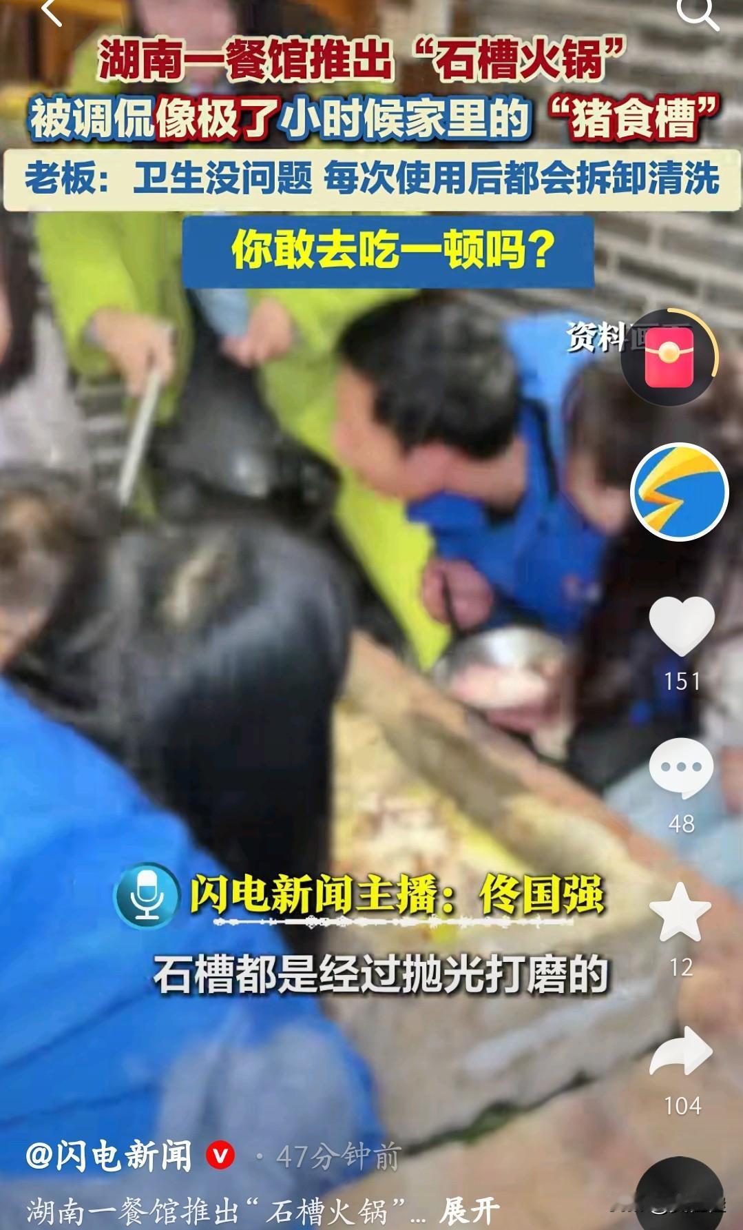 冬日生活打卡季湖南这家餐馆的石槽火锅也太有意思了!这石槽长90厘米、宽25厘米,看着跟小时候家里的猪食槽一模一样,不少人第一眼看到都忍不住笑。不过老板说石槽都经过抛光打磨,用完还会拆卸清洗,卫生这块不用担心。一群人围着石槽涮火锅,场面又新奇又热闹,不知道吃起来会不会别有一番滋味,你们敢去试试不?