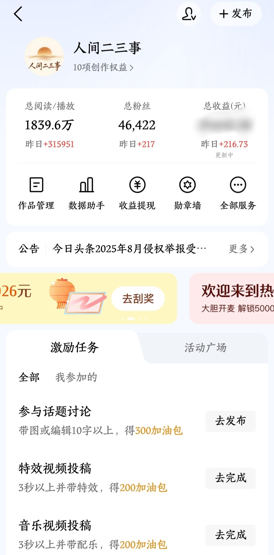 晒一下最近三天的收益,收益总是忽高忽低,不是很稳定,之前总是追求数量,没有注重质量,导致单价一直很低,最近开始注重质量了,尽量一天写6篇或者8篇微头条,单价上来了,但是今天单价不知道怎么又变低了,影响单价的因素到底是什么呢? 写头条两三年了,但之前都是断断续续的,2024年10月份左右开始认真日更,中间又断更了三四个月,而且一直在换领域,写过情感,写过影视,写过书评,现在开始尝试写社会热点了,希望一直坚持下去,做一个长期主义。