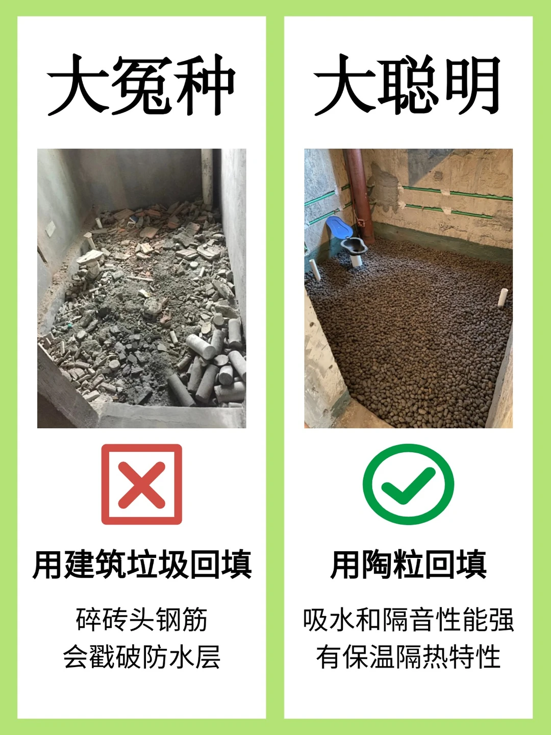 ❌ 用建筑垃圾回填:碎砖头钢筋会戳破防水层