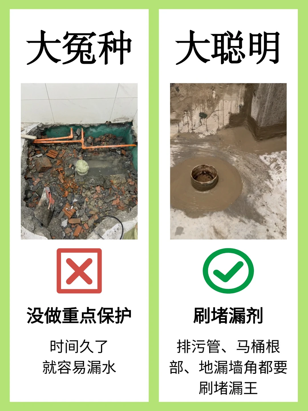 ✅ 刷堵漏剂:排污管、马桶根部、地漏墙角都要刷堵漏王