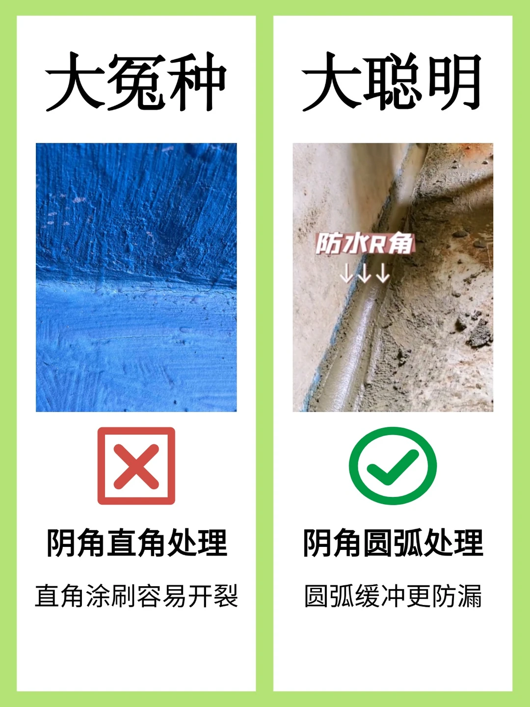 ❌ 不做阴角直角刷防水:直角涂刷容易开裂
