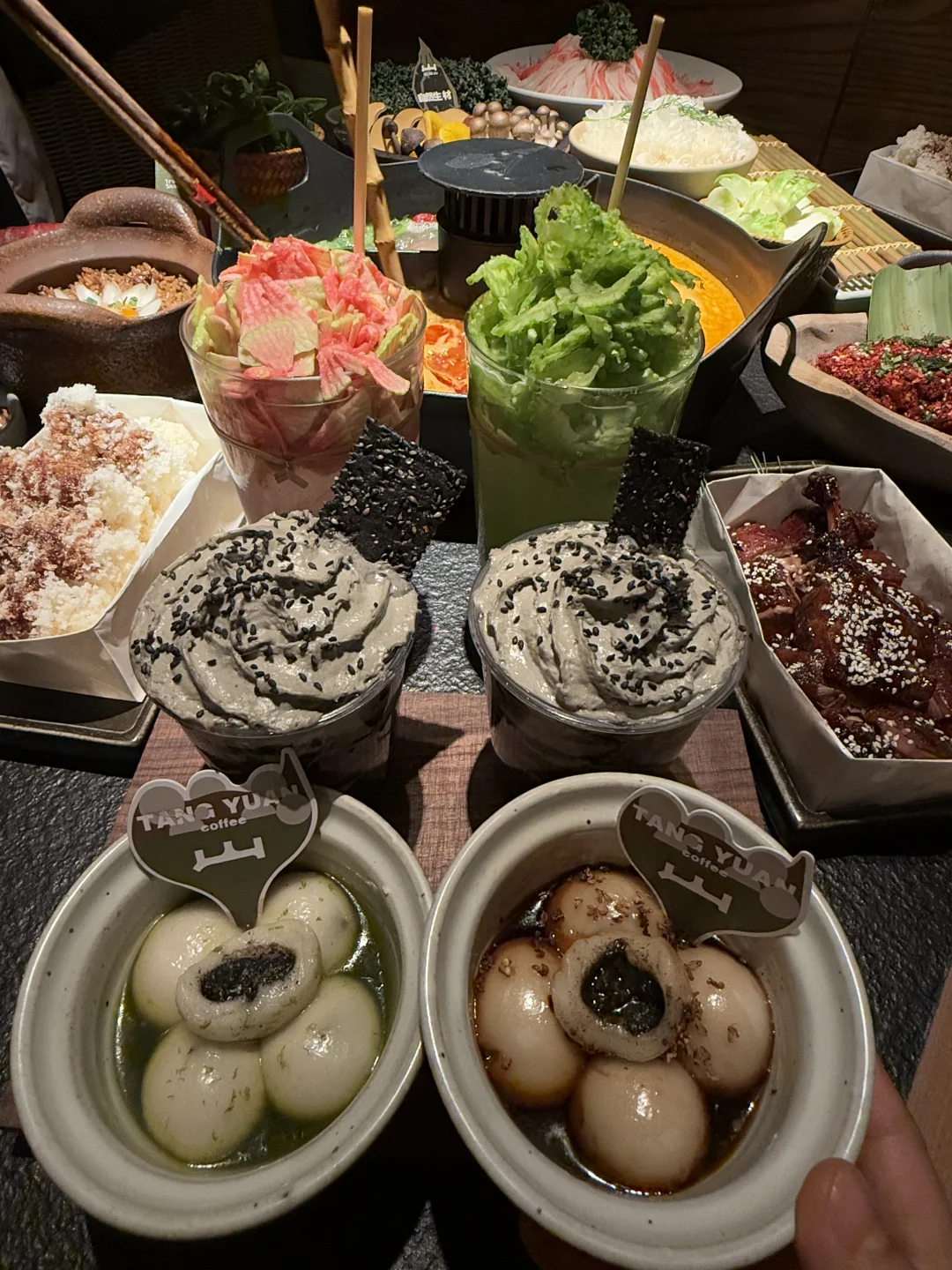 流心雪花糍,甜皮鸭,手作三色麻薯……… 想吃三出山不用再去万象城排队了!!各种甜品,手作鲜果饮品,山菌,野蔬………值得N刷的园林系火锅!! · 新出的黑芝麻山茶香快去喝!芝麻香和牛乳香融合,用黑芝麻饼干蘸着黑芝麻奶油顶吃一口沦陷啊啊啊 雪花糍糯必吃,叽叽脑袋千万不能错过,裹满蜜汁的甜皮鸭我必吃,三个味道的手作麻薯必吃,淋上咖啡液的咖啡汤圆…创意的甜品小吃饮料都好惊艳!! 臊子饭和坨坨牛肉也可以试试,个人觉得都不错! 还有各种奇怪叫不上名字的菌子和蔬菜…真见世面了! · 点了奔驰锅,麻辣+海鲜+牛骨汤三种味道,在麻辣锅涮上鲜切牛肉,在骨汤锅里涮上田七和姜柄瓜,再来一杯苦瓜气泡饮,真太chill啦!! 周末去哪儿西安拍照西安漂亮饭西安火锅西安美食西安大雁塔大悦城三出山西安吃喝玩乐美食小宇宙西安旅游