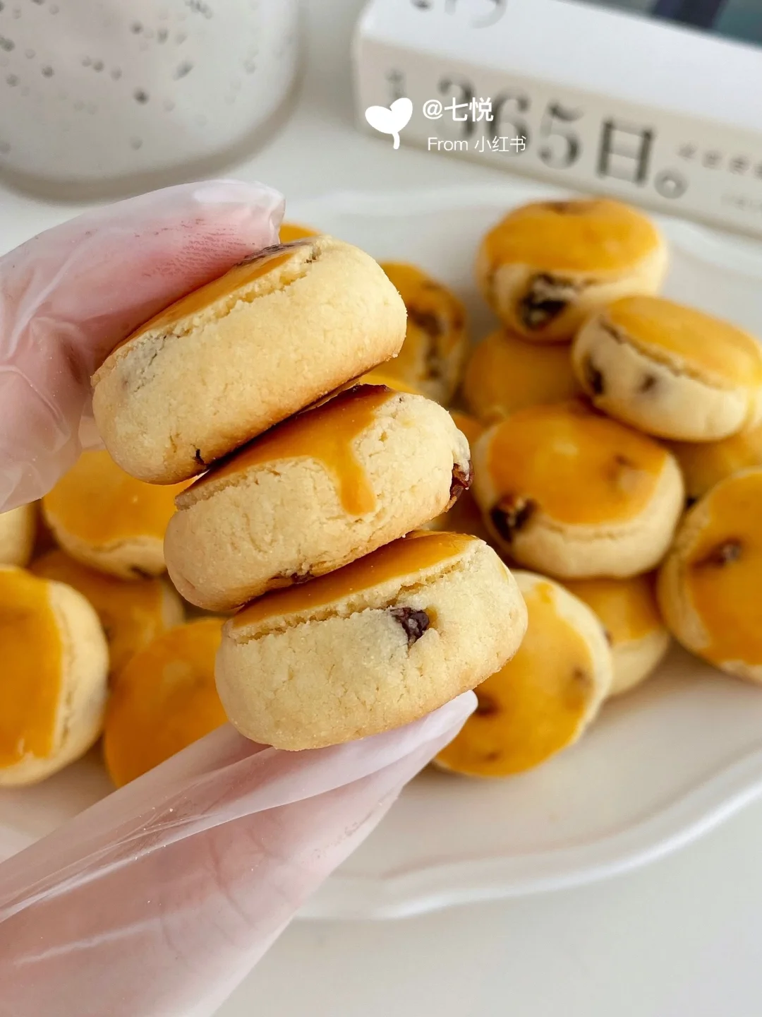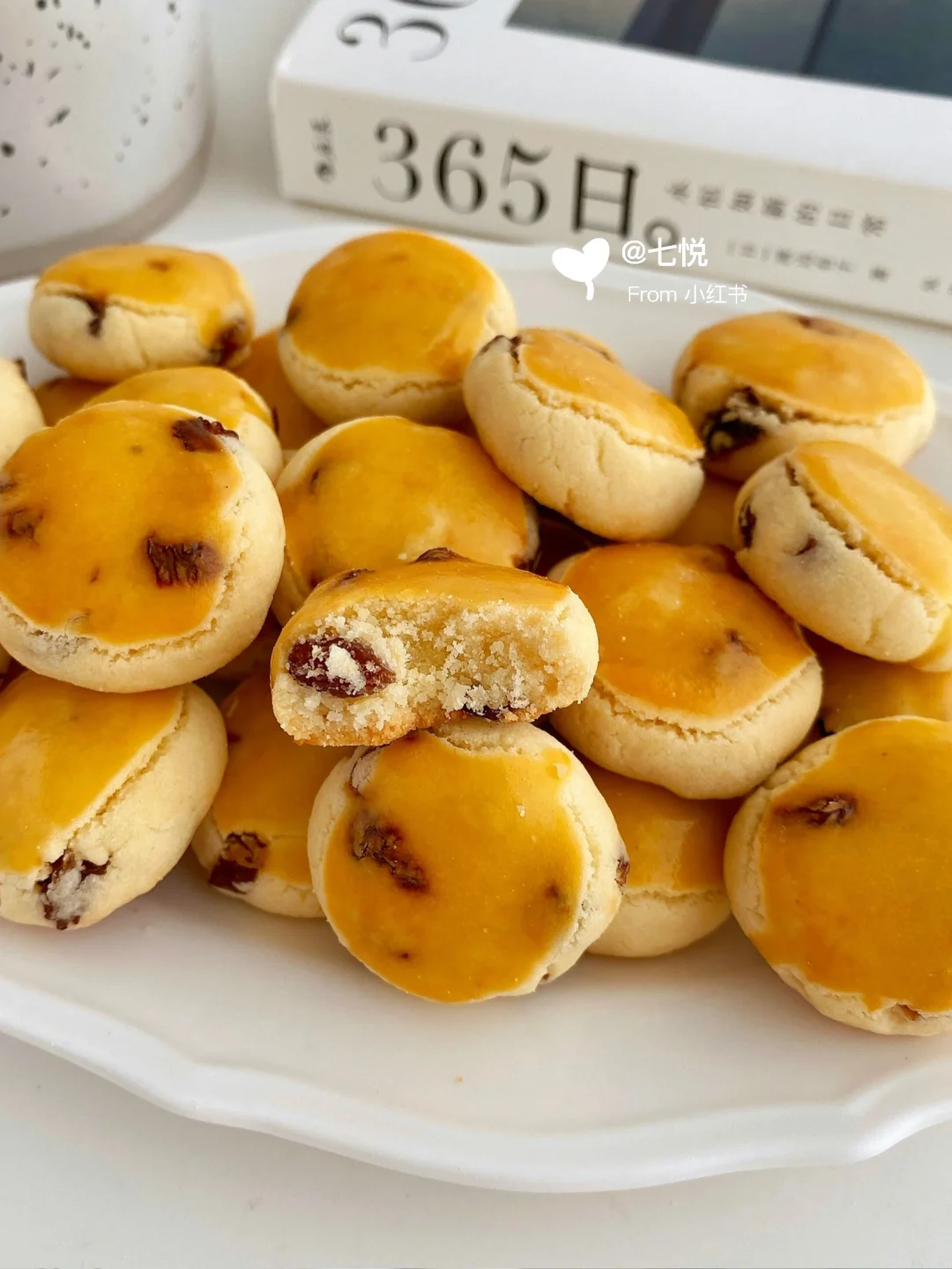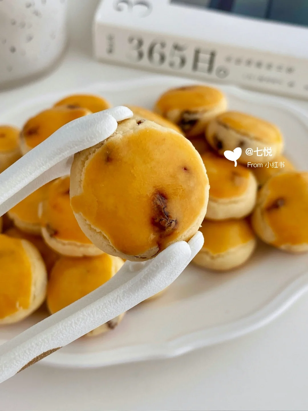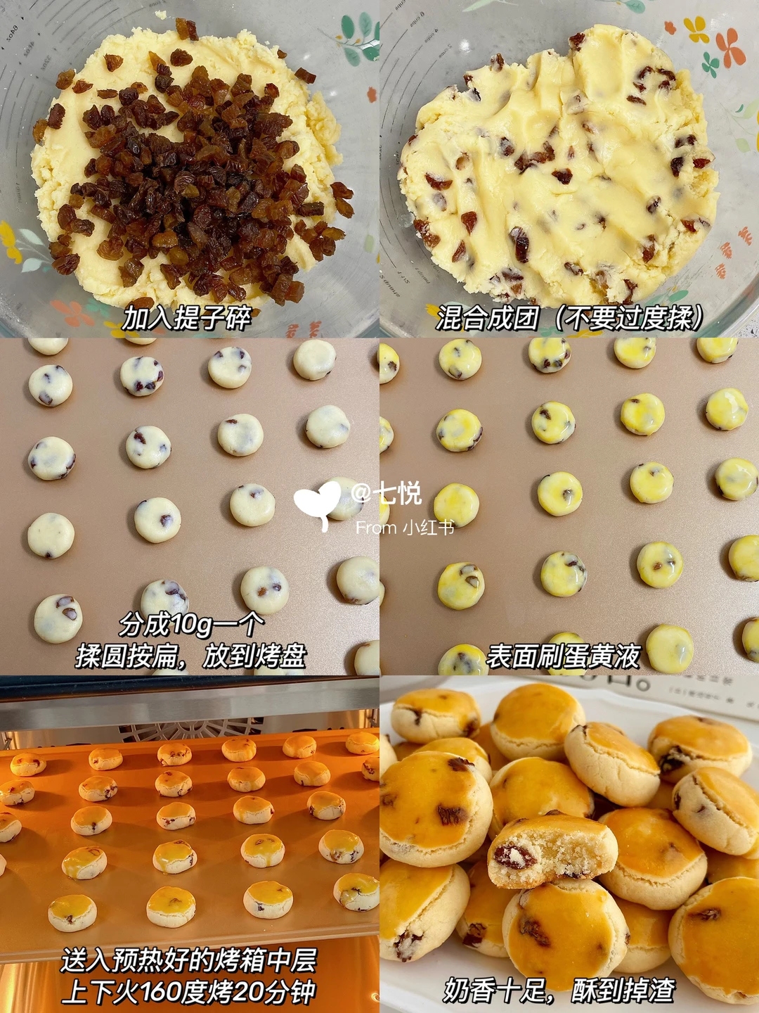 黄油80g,糖粉20g,常温鸡蛋液35g,低筋面粉110g,奶粉45g,提子碎50g(提子干提前泡水切碎)