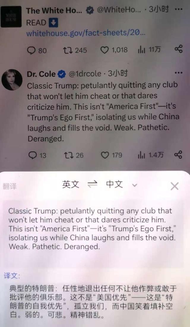 白宫通过社交媒体平台强调“美国优先”。而在评论区,许多网友对特朗普的“退群”决定表示担忧和不满。有人质疑称,“这不是‘美国优先’,而是‘特朗普的自我优先’,让我们在国际上孤立,中国会填补美国留下的空白”,特朗普的“退群”行为“软弱、可悲、精神错乱”。
