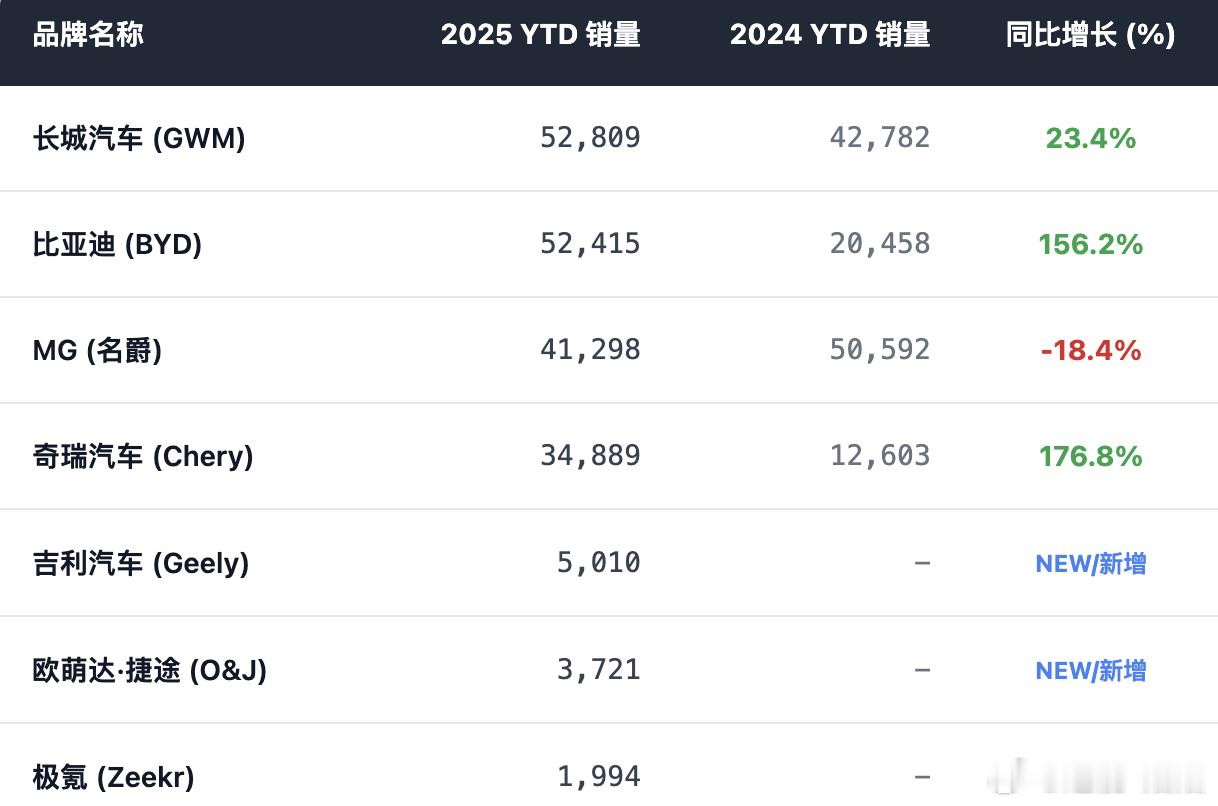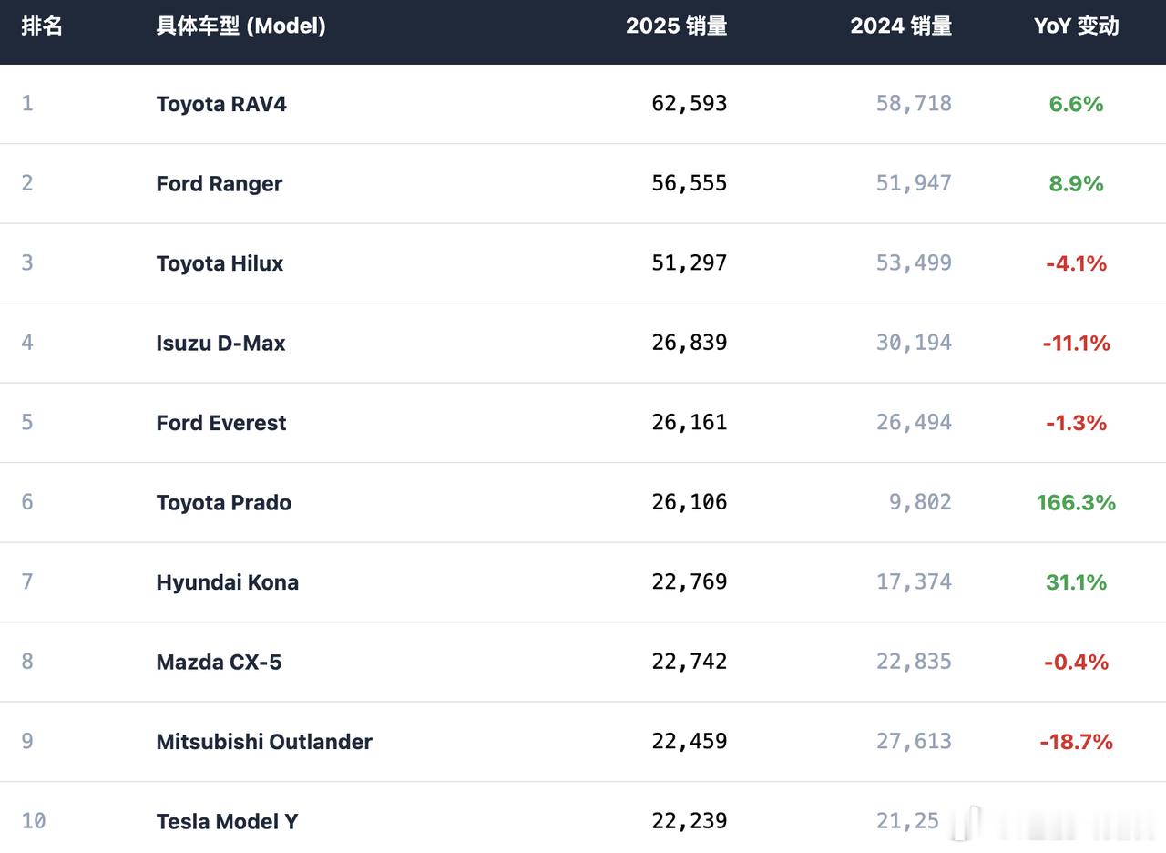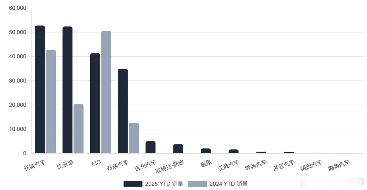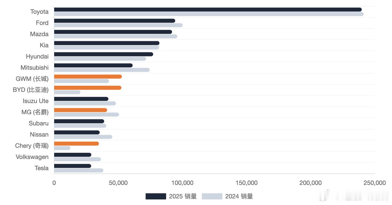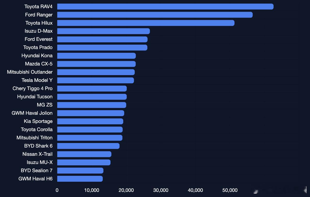 2025 澳大利亚车市销量微增 0.3%,连创三年纪录,在高利率、高生活成本下还能正增长,算是成熟市场里的少数派。这里没走激进纯电路线,插混增速超 130% 成最大亮点,混动、插混刚好适配当地对续航、补能的实际需求。中国品牌占比逼近 20%,成第二大汽车来源国,长城、比亚迪销量破 5 万进前十,奇瑞增速超 170%。澳市场无本土工业、消费者超理性,用车场景还特严苛,中国品牌能靠燃油、混动、纯电多路线适配站稳,确实靠的是真本事。