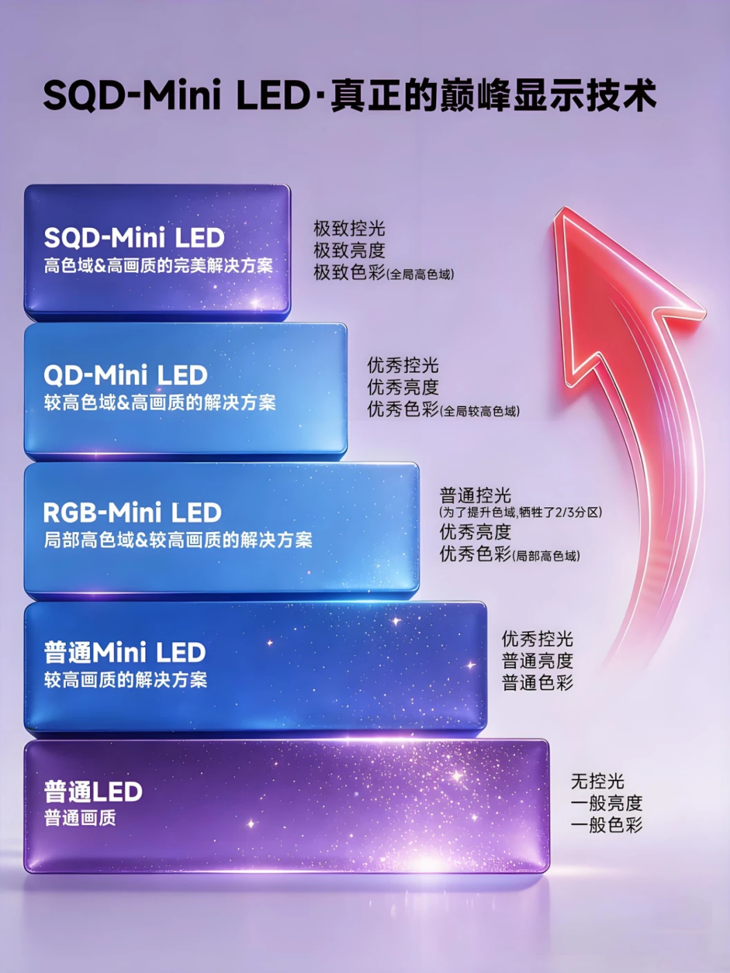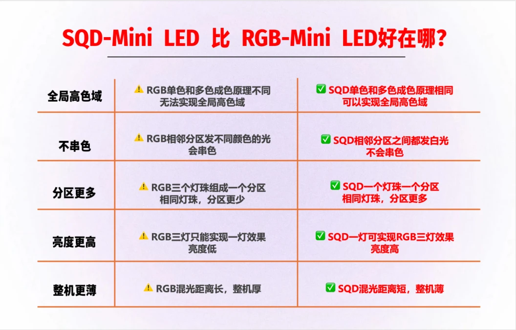 RGB-Mini LED 需要3个灯珠才能凑成1个背光分区,有效分区打折,暗部发黑、亮部溢光。Q10M系列的1个灯珠就是一个分区,同成本下分区数是RGB的3-6倍,并且搭载万象分区技术,从发光到成像全链路优化升级,达到像素级精准控光效果,明暗层次立体通透。