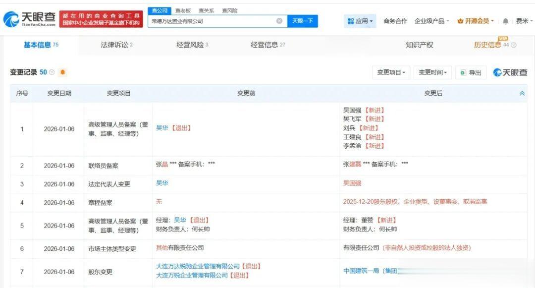 天眼查工商信息显示,近日,常德万达置业有限公司发生工商变更,原股东万达商管旗下大连万锐企业管理有限公司、大连万达锐驰企业管理有限公司退出,新增中国建筑一局(集团)有限公司为全资股东,吴华卸任法定代表人,由吴国强接任,同时多位主要人员发生变更。