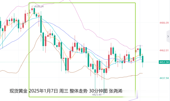 1月8日:上交易日周三(1月7日):国际黄金遇阻回落收跌,反弹动力减弱,但仍处于中轨和短期均线上方,多头占据优势,并也是再度入场看涨的机会,不过临近周围重磅数据的公布,也需留意数据预期带来的利空压力,要么待数据公布后或下周开盘再多,要么待数据公布显示利好后顺势跟进。