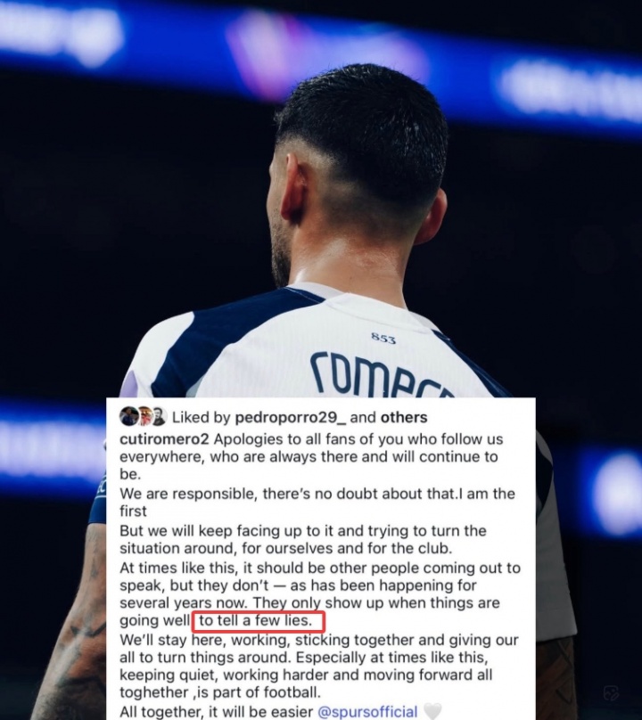 直播吧01月08日讯英超第21轮比赛,热刺客场2-3不敌伯恩茅斯,热刺后卫罗梅罗社媒发文,其中表示本应有其他人站出来发声,他们只会在顺利时出现去说一些谎言。