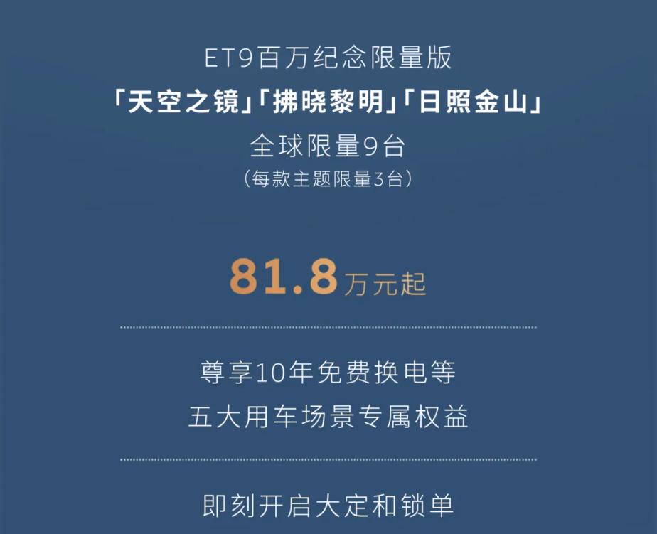 【81.8万起,限量9台,蔚来ET9百万纪念版上市】日前,蔚来汽车宣布推出ET9百万纪念限量版,全球限量9台,含“天空之境、拂晓黎明、日照金山”3款主题,每款3台,起售价81.8万元,附赠10年免费换电等专属权益。车身及内饰多处印有“1000000”纪念标识,配置与此前ET9地平线特别版基本一致:封闭式前脸配Micro LED灯组,四座布局,新增双拼色与实木装饰,中控15.6英寸悬浮屏配骁龙8295P芯片,10升冰箱、14.5英寸娱乐屏、行政桌板等齐备。车辆基于900V高压平台打造,采用碳化硅技术的电驱四驱系统,前电机最大功率180千瓦,后电机最大功率340千瓦,系统综合扭矩为700牛·米,零百加速时间4.3秒。标配100千瓦时电池包,CLTC工况下续航里程为650公里(22英寸车轮)和620公里(23英寸车轮),充电5分钟可增加约255公里的理论行驶里程;换电模式,只需3分钟即可完成。【来自懂车帝车友圈】