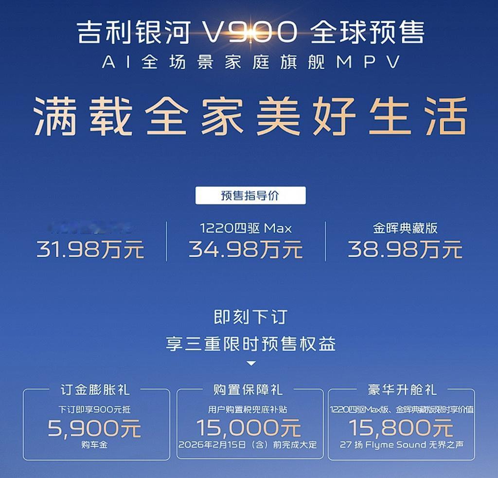 【银河V900预售31.98万起,增程动力,可选8座!】日前,吉利银河混动MPV车型V900开启预售,共推出3款车型,预售价区间为31.98-38.98万元。该车可以看作是吉利银河翼真L380的增程版,前脸配备星河长虹贯穿灯和专属24K曜金天马车标,并拥有大尺寸的镀铬中网,分体式大灯隐藏于波浪格栅中。 车身尺寸方面,车辆长宽高分别为5360/1998/1920mm,轴距为3200mm,体量庞大,提供六座七座和八座不同的座椅布局。空间方面,吉利银河V900得房率达到91.8%,全车提供42处收纳储物空间,其二三排纵向空间均超过1000mm,后备箱容积超过1000L可容纳15个20寸登机箱,并提供163L下沉储物空间。 内部配有10.25英寸仪表屏、19.8英寸AR-HUD、15.4英寸中控屏以及9.2寸高清流媒体后视镜,座舱为Flyme Auto 2系统,搭载骁龙8295P芯片。二排提供17.3英寸娱乐屏,扶手处配备5.98英寸功能控制屏,全车拥有4个智能50W风冷无线快充。 同时还配备云感SPA座椅,支持加热、通风、记忆、SPA级按摩;Flyme Sound无界之声27扬声器系统,9.1.6声场,功率2300W,支持AI无麦K歌等功能;并拥有-6~50 °C温域的9.1L大容量冷暖箱。 辅助驾驶方面,吉利银河V900全系配激光雷达,搭载千里浩瀚辅助驾驶H5方案,采用英伟达Orin系列高算力芯片,支持全国范围内高速NOA、城市NOA。此外,车辆还将配备11个安全气囊 ,提供224L超大侧气帘,采用3.1米长的贯通式无断点设计,侧面碰撞时有效保护每一排乘客的头部。 动力方面,吉利银河V900将搭载由1.5T发动机+双电机组成的增程动力系统,系统最大功率340kW,峰值扭矩523N·m,匹配宁德时代骁遥电池包,CLTC纯电续航为260km,满油满电综合续航为1220km。底盘方面,新车配备CCD电磁阻尼、空气悬架及主动魔毯悬架系统,20毫秒级响应,每秒调节50次,空气悬架则支持65mm超大可调范围,5档高度调节(包含迎宾模式)【来自懂车帝车友圈】