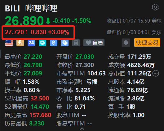 格隆汇1月8日|哔哩哔哩(BILI.US)美股盘前涨3%报27.72美元。消息上,摩根士丹利认为,哔哩哔哩的广告业务表现稳健,但游戏业务前景未明朗,对其美股给予「与大市同步」评级,目标价为26美元。此外,哔哩哔哩计划于2026年投资AI基础设施以提升算法精准度,并有望继续与央视合作,进一步加强品牌影响力。