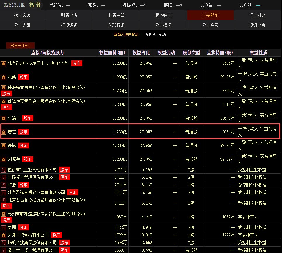 根据choice统计,智谱创立发起人唐杰在智谱股权占比约为6.1%,按照市值计算,唐杰身家增至35.31亿港元。