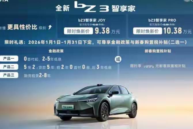 比亚迪秦PLUS EV没想到,小鹏MONA M03没想到,日产N7没想到,连零跑B01也没想到,那个敢用真人完成碰撞测试的bZ3在2025年的最后一天,居然以9.38万元的限时焕新价,推出两款智享家,新车升配降价,把合资纯电B级车拉到了10万级,搅动智电B级市场风云。 丰田品质B级纯电家轿9.38万 一汽丰田宣布bZ3智享家以9.38万元限时焕新价进入市场时,整个智电B级车领域都为之震动,比亚迪秦PLUS EV、小鹏MONA M03、日产N7、零跑B01等竞争对手纷纷感受到了前所未有的压力。 从配置来看,bZ3智享家竞争力十足。智享家JOY版和智享家PRO版作为此次的主打版本,在配置上远超同价位车型。 JOY版标配18英寸轮毂、后驻车雷达、倒车影像、L2级辅助驾驶、遥控钥匙、一键启动、前排无钥匙进入等丰富配置; PRO版在此基础上增加了前驻车雷达、电动天窗、外后视镜加热、真皮多功能方向盘、前排手机无线充电等,舒适性大幅提升。 在智能驾驶辅助上,bZ3智享家搭载的Toyota Pilot智能驾驶辅助系统集成了Momenta5.0城区辅助驾驶和丰田TSS3.0智行安全系统,经过超20亿公里验证,可靠性极高。 32颗智能感知硬件(含激光雷达)和544 TOPS大算力芯片,让其能轻松应对各种复杂路况,像ILPP记忆泊车功能,可记忆3000米路线,学习100个车位,对新手和停车困难的用户来说十分友好。 续航方面,CLTC续航最高可达610km,日常通勤和短途旅行都不在话下,快充30 - 80%仅需27分钟,也有效缓解了用户的续航焦虑。 bZ3智享家以超高的性价比和强大的产品力,在10万级智电B级车市场中成功撕开一道口子,后续它又将如何续写辉煌,让我们持续关注。