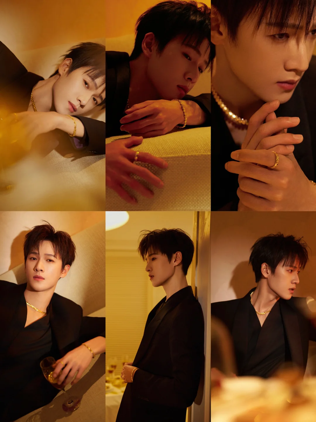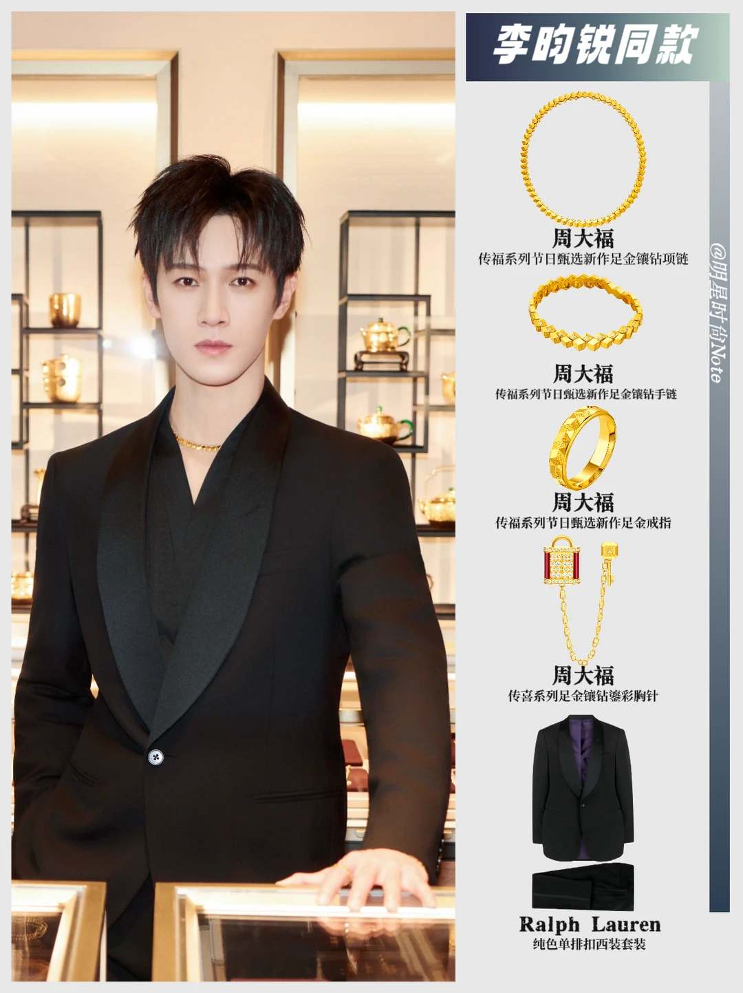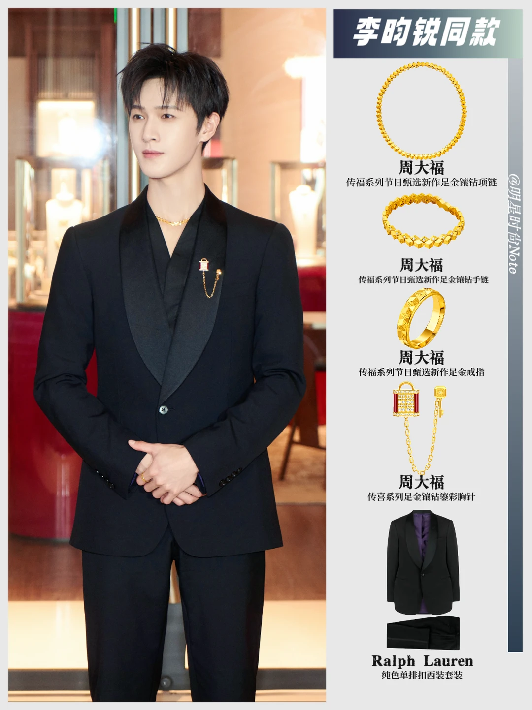 黑色西装搭配黄金珠宝,在他身上竟然透着一种干净的矜贵感✨ 上身的是周大福传福系列节日甄选新作的戒指、手链、项链,以及传喜系列的胸针,精致感拿捏得恰到好处。没有浮夸的设计,暖调的店铺灯光一打,整个人像自带柔光,简单穿搭因细节而亮眼💎
