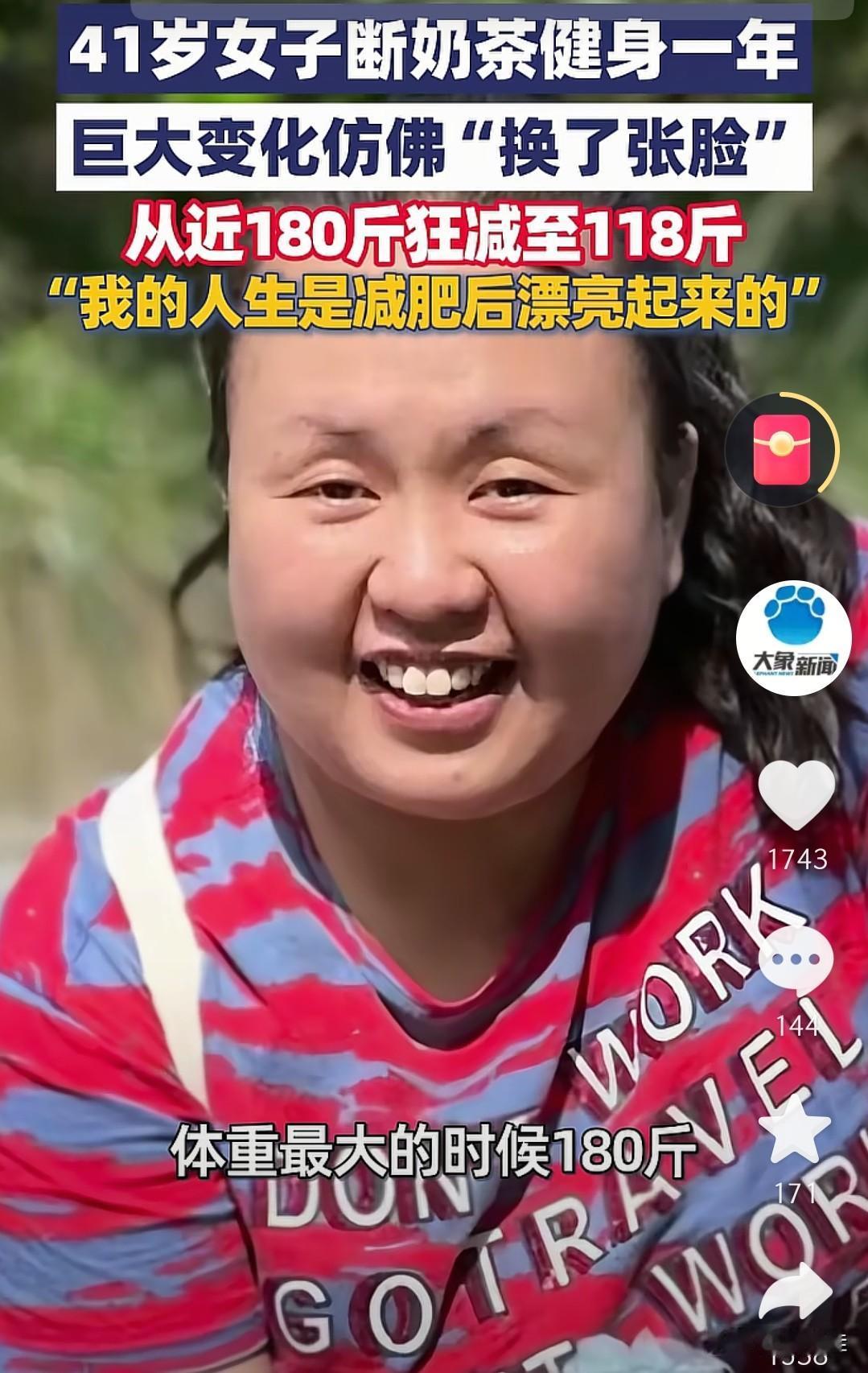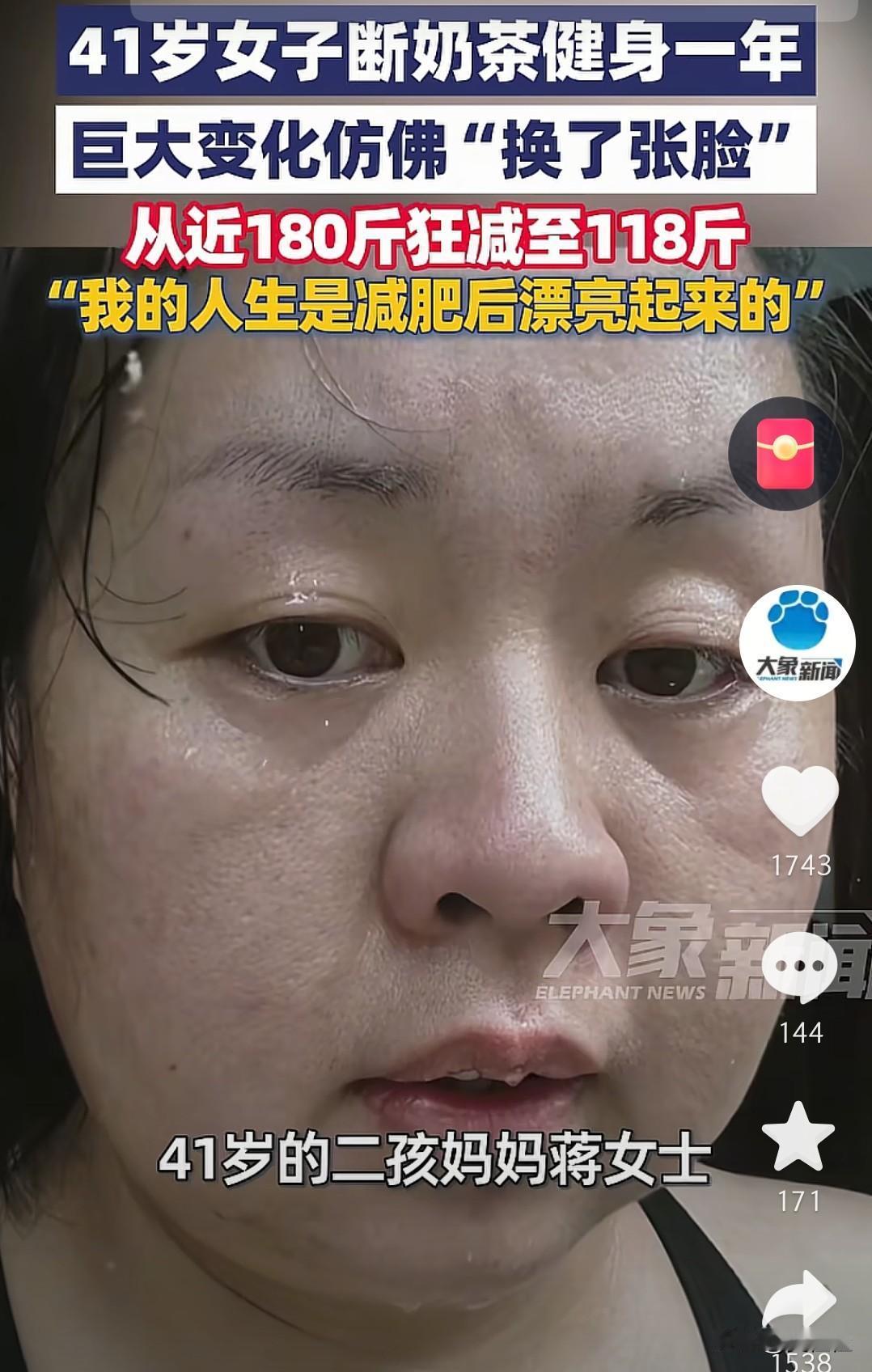 别再喝奶茶了,看这位妈妈!41岁的蒋女士是两个孩子的妈妈,曾经体重飙到近180斤,爱喝奶茶的习惯让她身材走样,整个人看着没精神。后来她狠下心戒掉奶茶,一头扎进健身房坚持锻炼,这一练就是一整年。 如今她成功瘦到118斤,足足减了60多斤,整个人像换了张脸,不仅身材紧致了,气色和精神头也跟着变好。她笑着说“我的人生是减肥后漂亮起来的”,这话听着实在又戳心。 其实减肥哪有什么捷径,无非是管住嘴、迈开腿。这位妈妈用一年的坚持证明,年龄从来不是借口,只要肯对自己狠一点,愿意坚持,普通人也能活成自己想要的样子。