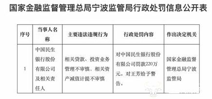 具体来看,2025年12月31日,民生银行因相关贷款、投资业务管理不审慎,相关资产减值计提不审慎等多项违法事实被国家金融监督管理总局宁波监管局罚款220万元;同时相关责任人王芳被给予警告。