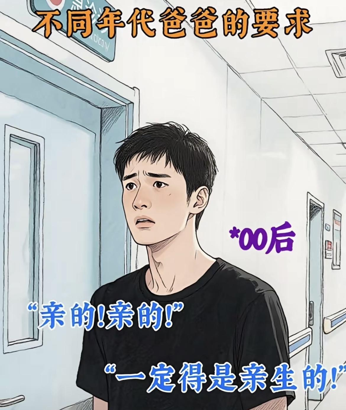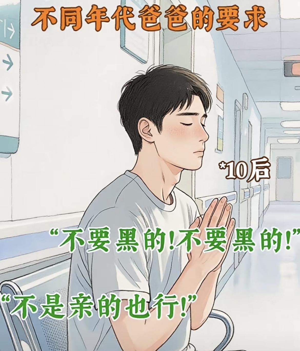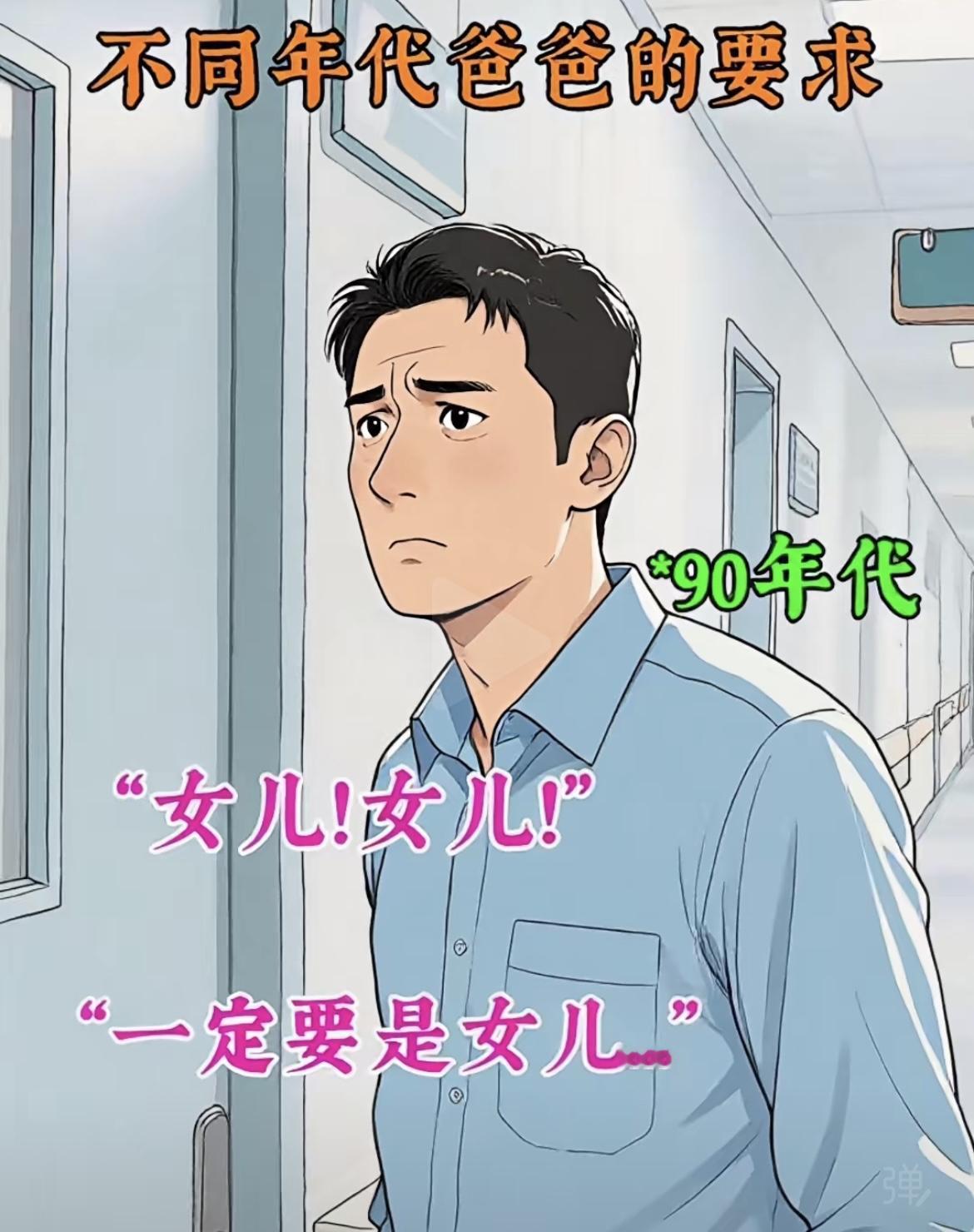 不同时代爸爸的期盼:变的是诉求,不变的是父爱 1. 80年代的爸爸:执着喊着“必须是儿子”,是受传统观念影响的朴素执念,盼着家族血脉的延续,藏着对“后继有人”的质朴期许。 2. 90年代的爸爸:满心念叨“一定要是女儿”,是观念逐渐柔软的体现,盼着贴心小棉袄的陪伴,流露着对温馨亲子时光的向往。 3. 00后的爸爸:紧张说着“得是亲生的”,是对血缘联结的在意,更是对新生命专属的珍视,怕错过与孩子相伴的每一段旅程。 4. 10后的爸爸:调侃祈祷“不要黑的,非亲生也无妨”,是带着玩笑的轻松心态,褪去了刻板执念,只愿孩子拥有健康可爱的模样。