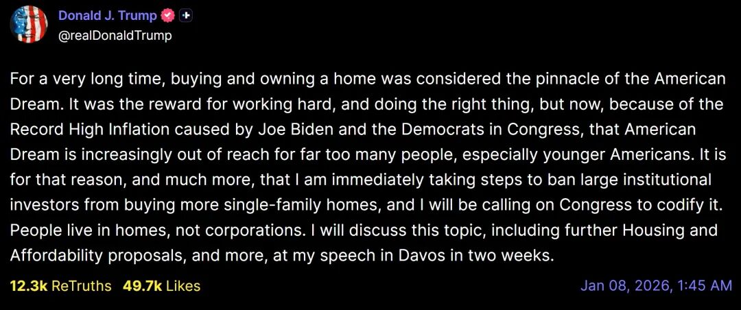 1月7日,特朗普在社交媒体TruthSocial上表示,为应对全美愈发严重的住房短缺问题,政府将禁止大型机构投资者购买住宅。同时,他“将立即采取措施,呼吁国会立法”。