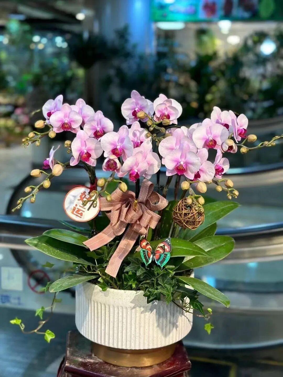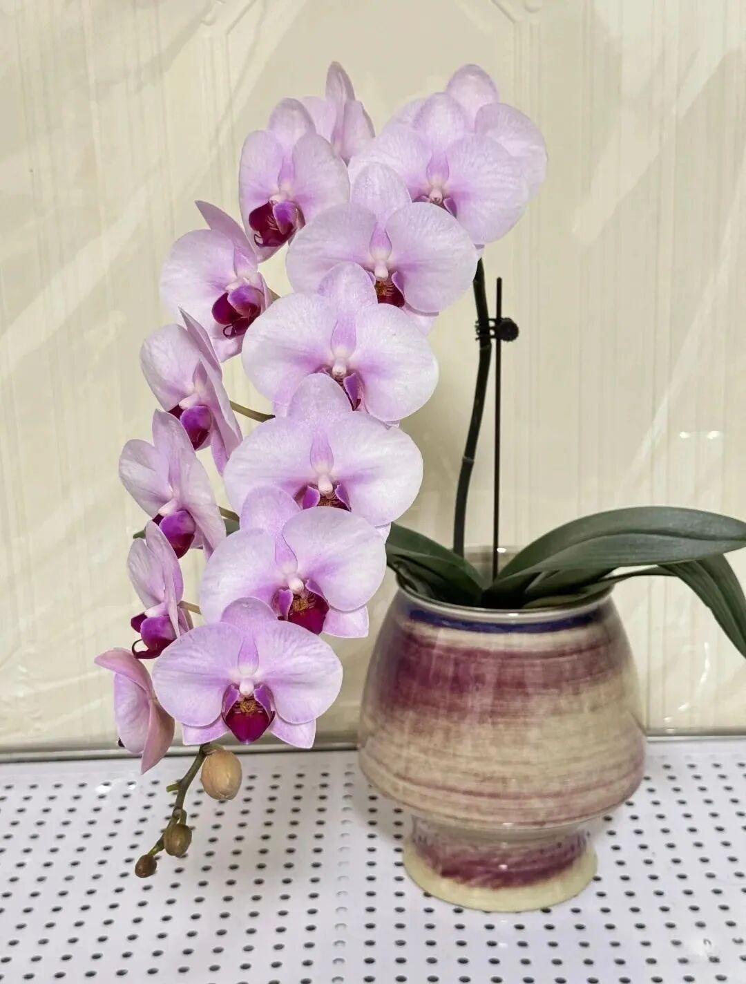 蝴蝶兰之美——杭州美女 “杭州美女”蝴蝶兰,光听名字就自带江南温婉气质,是蝴蝶兰里很受欢迎的一个品种。它的美很贴合“美女”之名,中花型的花朵白底晕着紫粉色,花瓣边缘的粉色脉纹像淡淡的腮红,柔美又精致,配上肥厚的椭圆形大叶片,观赏感拉满。 最讨喜的是它养护不费心,适应能力强,耐热还能露养(夏季遮阴即可),就算室内光照不足、温度稍低,也能正常开花,新手也能轻松驾驭。而且它花期超久,能开5个月以上,续花性、复花性都好,抽梗多、花苞密,一次开花能赏很久。 因为颜值高、寓意好,它常被当作乔迁、生日的礼品,既能带来视觉享受,也能传递美好祝福,不管是自己养还是送人情,都是很不错的选择。