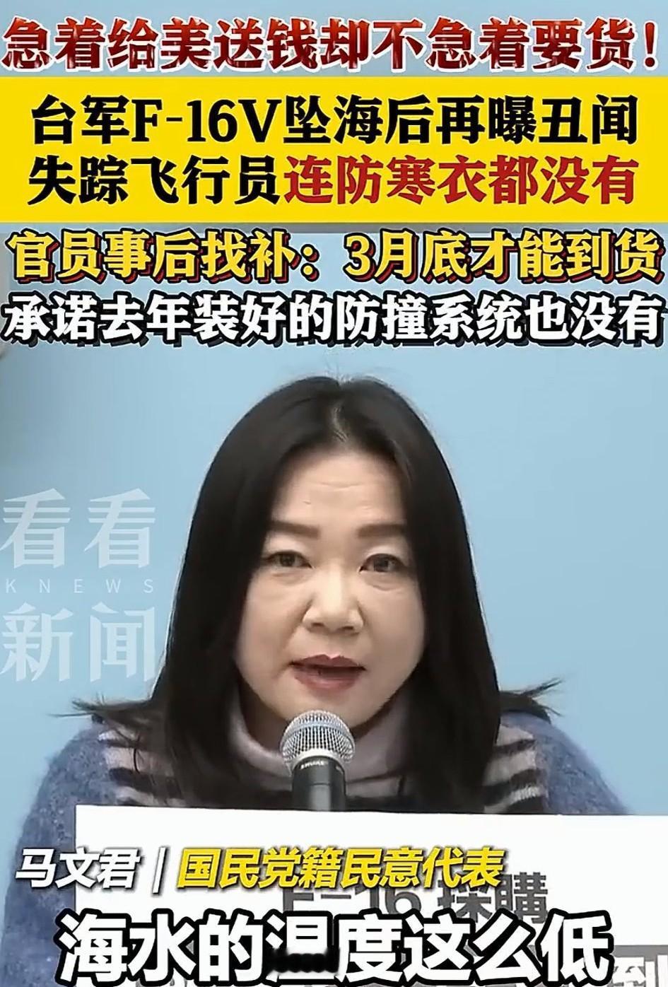 如何看台军失事飞行员连防寒服都没有这个问题。 根据国民党民代马文君的表述,首先确认的是,要配给台军战斗机飞行员的这些防寒服,台防务主管部门是早早就做了好预算的,而且还预付了款项。 接下来熟悉的操作出现了。 马文君表述大概是,台防务部门编预算时很积极,速度很快,付款更快。可是也就快到付款这一步。 至于付款以后,什么时候交货,好像就不是台防务部门的事了。不闻不问了。 为什么会出现这种情况? 前段时间因为民进党又要向美国采购上百亿美元的武器装备。当时岛内网友就抗议,民进党只懂付款,从不问来货。 还有之前美媒也透露过,五角大楼也承认,美国目前根本无法保证安全的把台军采购的武器装备运送到台湾岛。因为运输过程中这些交付的武器装备,随时都有被解放军击沉海底的可能。 根据相关消息称,目前台军积压在美国的已采购军事装备都有几十亿美元了。 从中可以看出,民进党只会“送、送、送”。根本不管有没有交付,能不能交付。 这应该就是台军失事飞行员没有防寒服的原因。