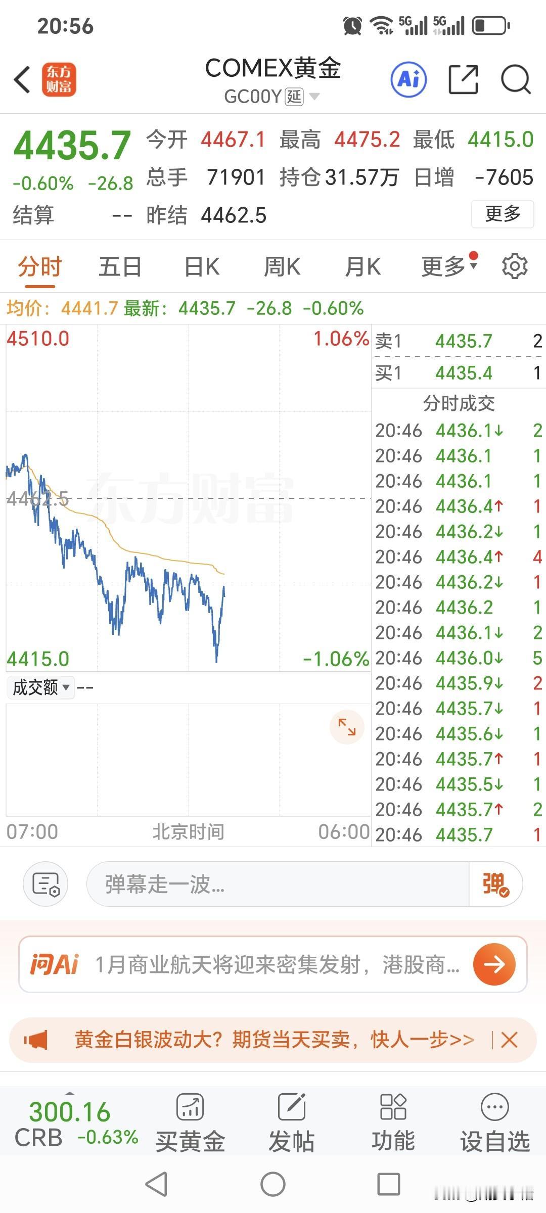 马上就是国内 贵金属夜盘交易时间了。 先看下国际金价走势情况, 国际金价4435.7美元, 略微低于15点价格。 加上周四国内黄金期货 收盘价低于结算价。 因此今晚低开概率大!