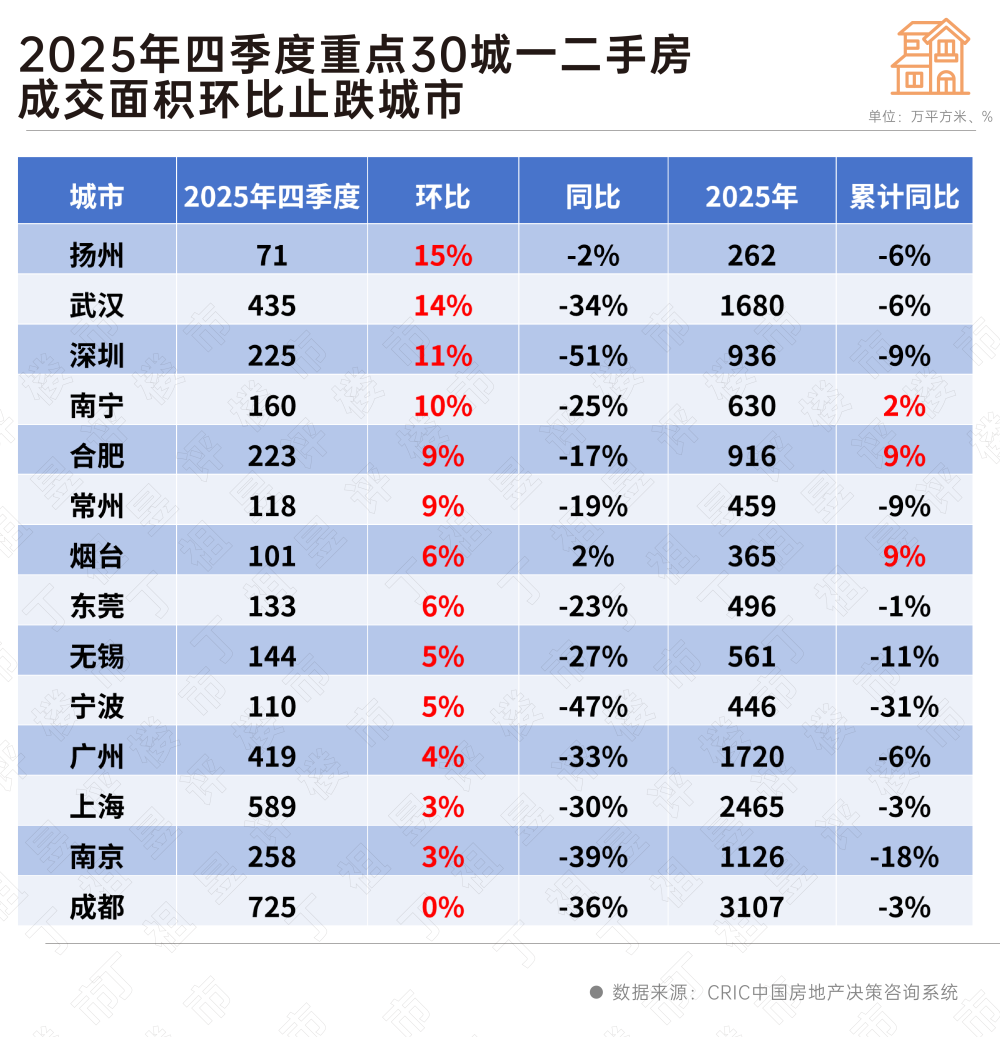 还有一个是季度信号,2025年四季度,有接近半数的城市环比增速已转正或持平,市场下行势头在年末有所减缓,部分城市出现企稳迹象,比如扬州、武汉、深圳四季度环比涨幅均在10%以上,另外合肥、上海、成都环比也有5%左右的增速,这些城市年末展现出积极的环比反弹,市场活跃度明显提升。