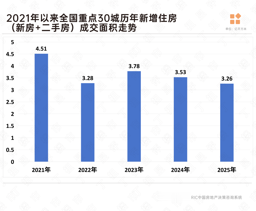 数据显示,2025年全国30个重点城市的新房成交面积约3.26亿平方米,规模与2022年差不多,处于近四年来的中间水平,同比7%的降幅与去年保持一致,这说明住房需求总体保持稳定。