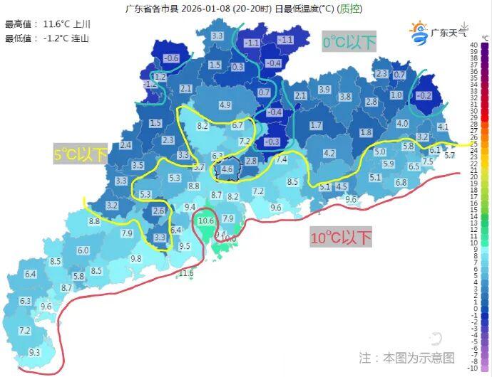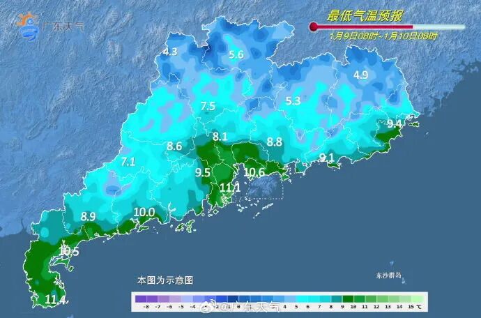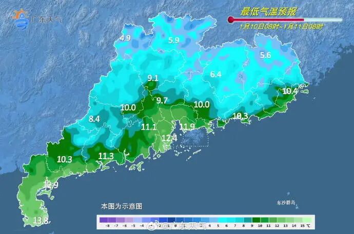 10日白天云量增加,气温回升,夜间起新一股冷空气补充影响广东,但由于引导冷空气南下的高空槽纬度偏北,这股冷空气的影响不会特别强,11日白天广东省各地的最高气温有小幅下降,早晚依然较寒冷。