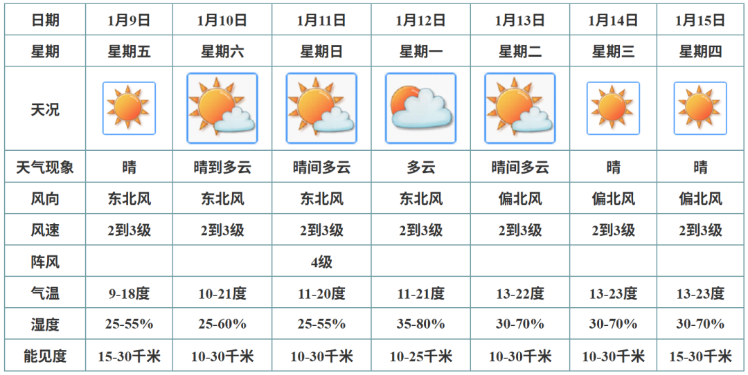 预计,9-11日,晴朗干燥,气温缓慢回升;12日受偏南气流影响,云量增多;13-15日晴间多云。全市森林火险红色预警信号生效中,需注意森林防火及家居用火用电安全。