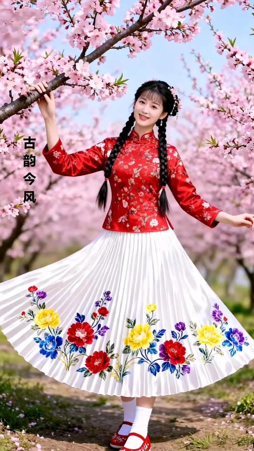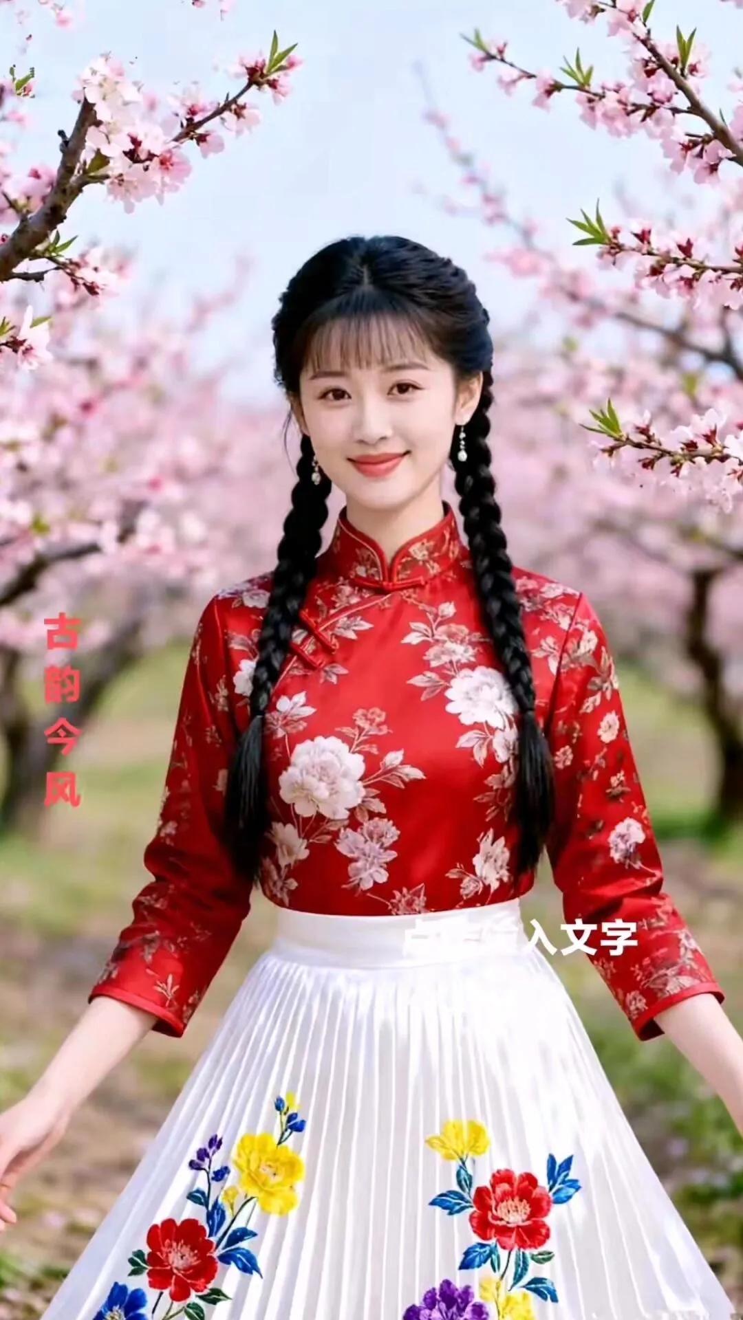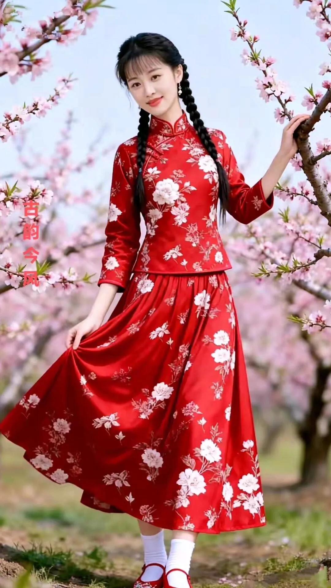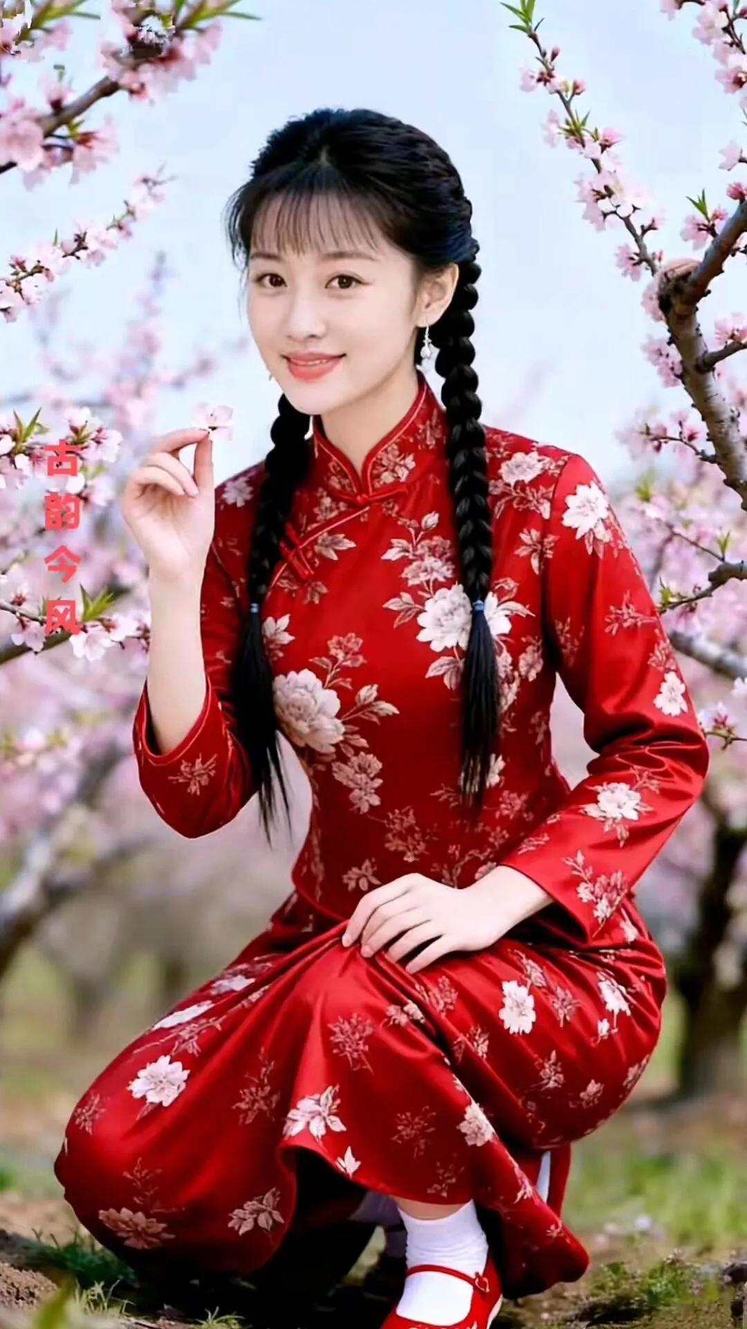 古韵今风,花间美人,红衣飘逸,春意盎然。