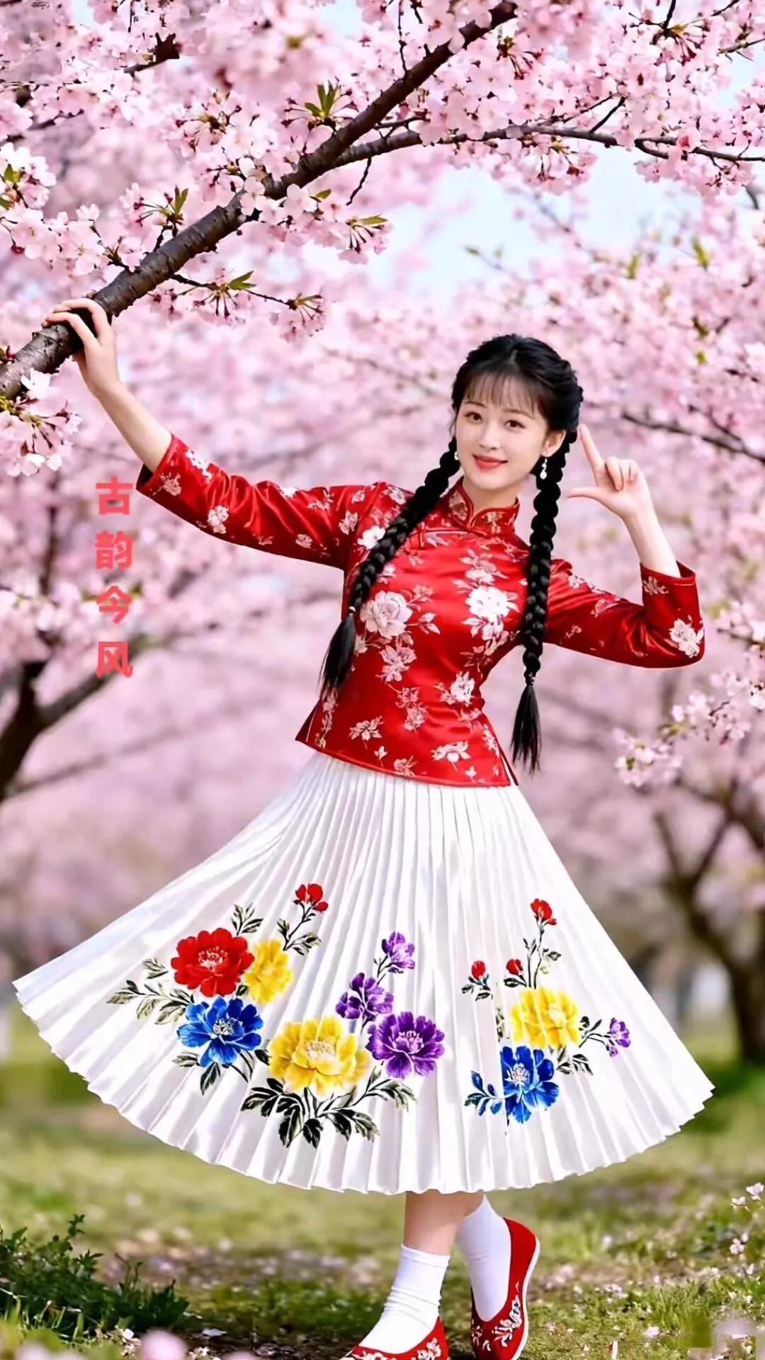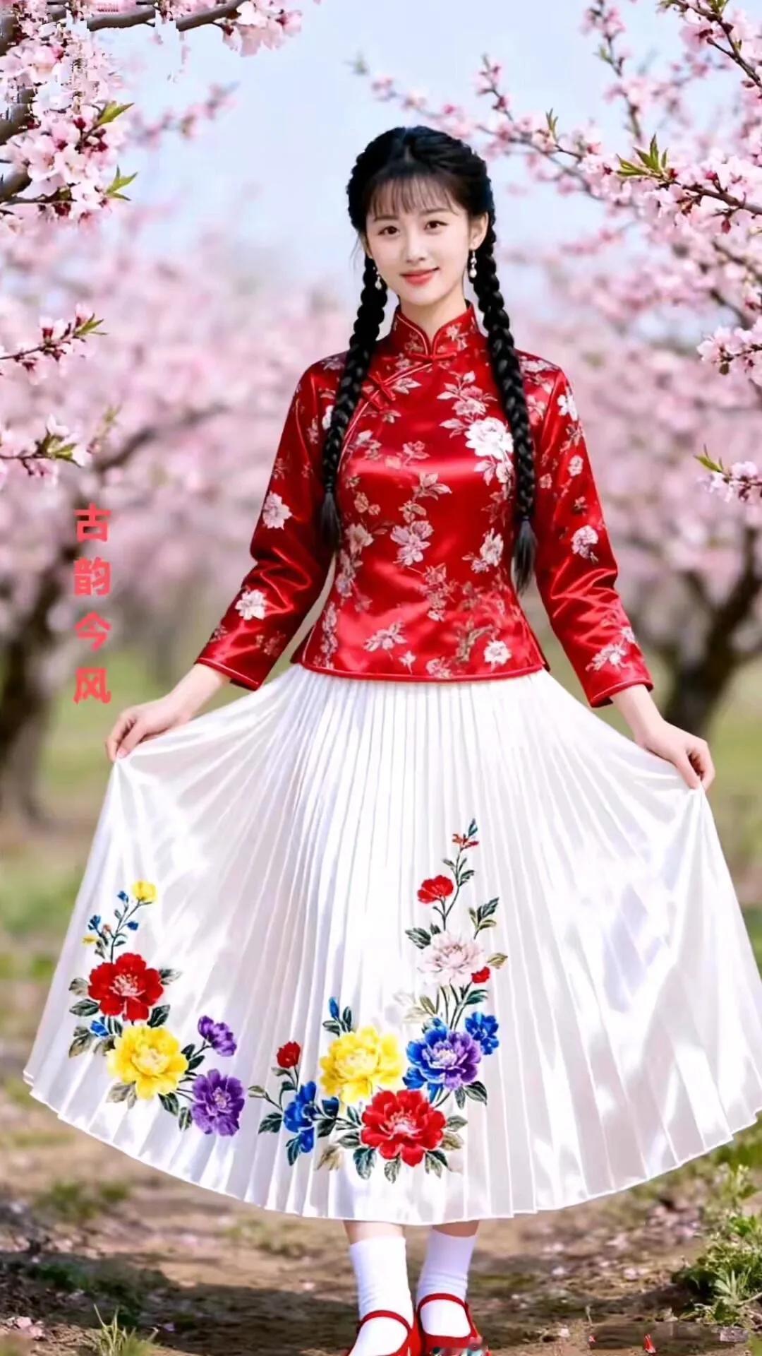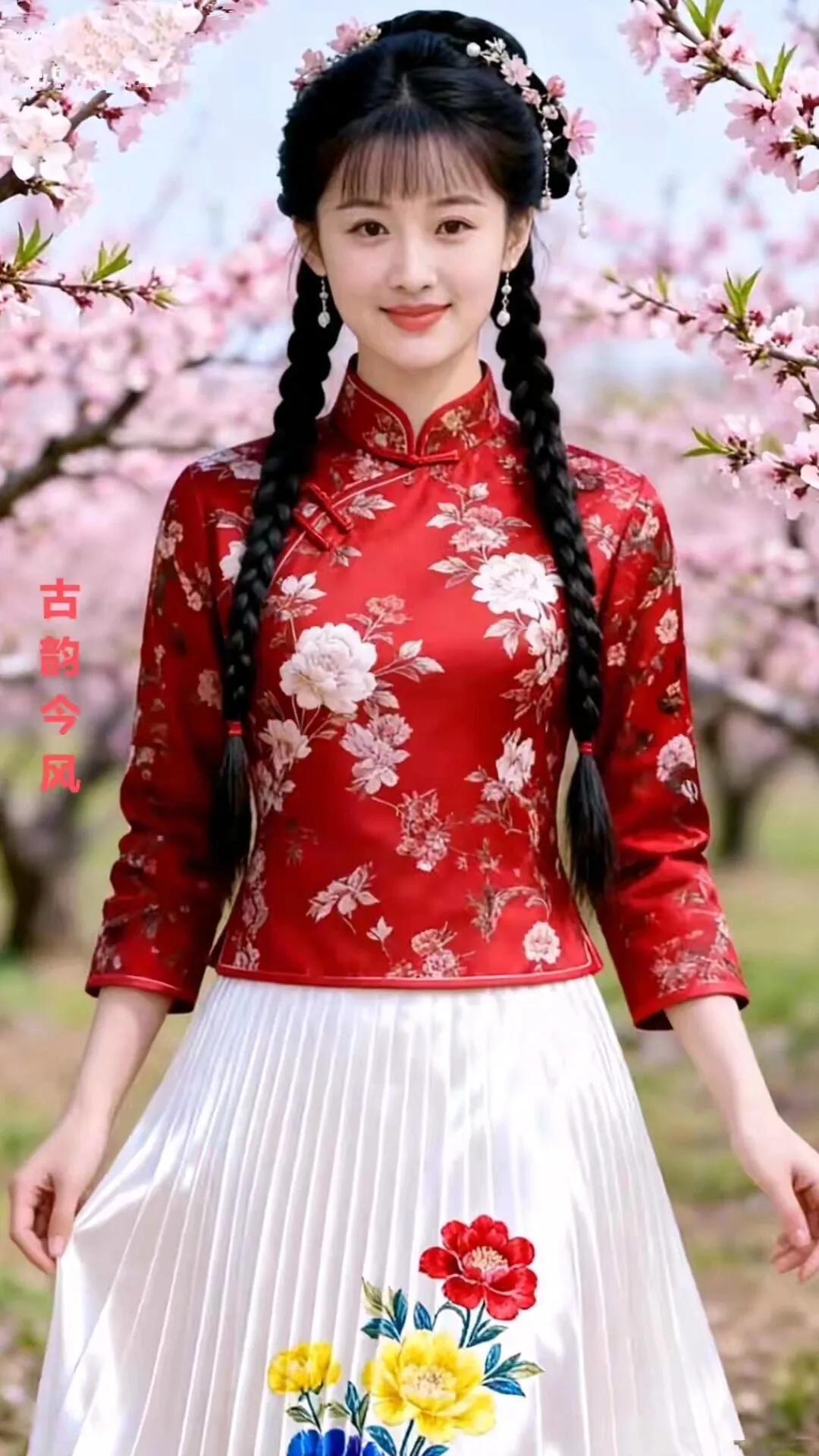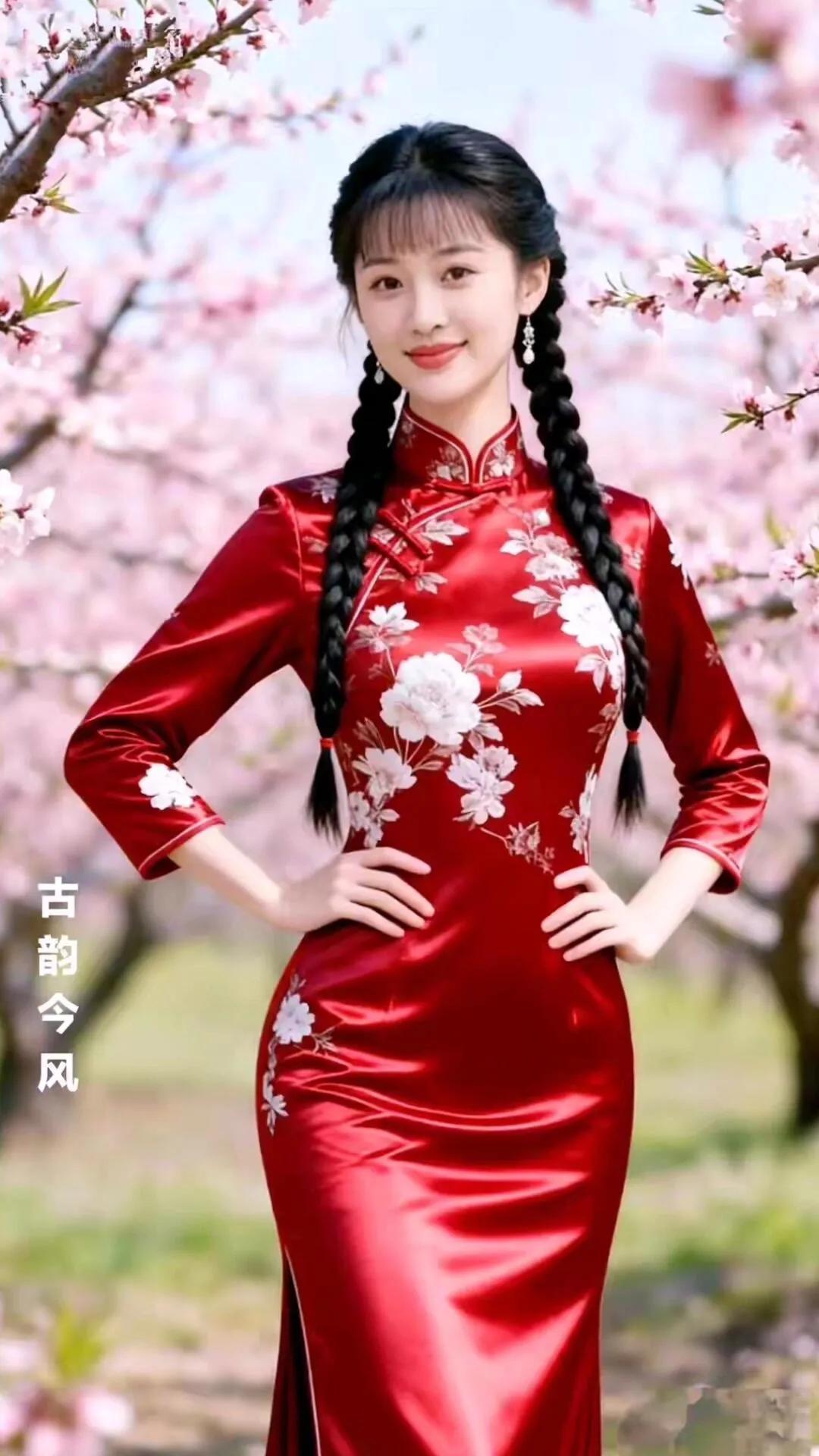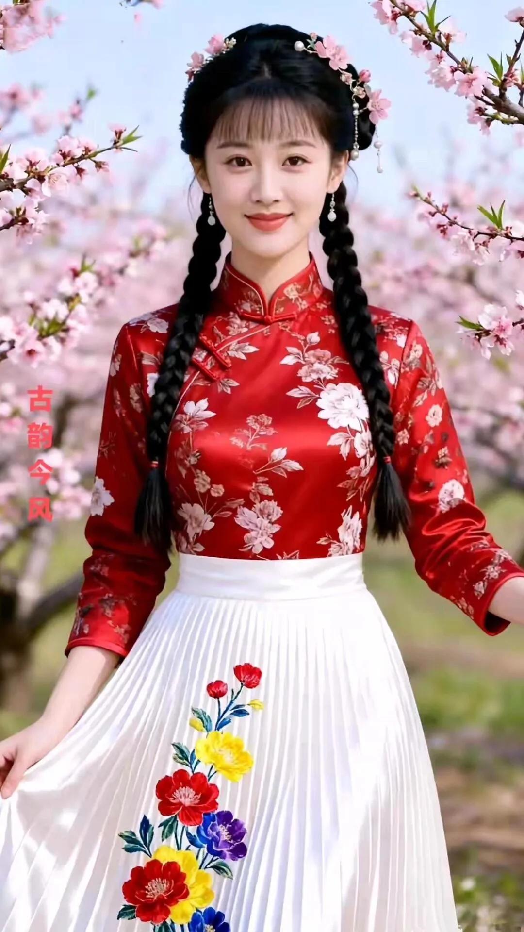 古韵今风,花间美人,红衣飘逸,春意盎然。