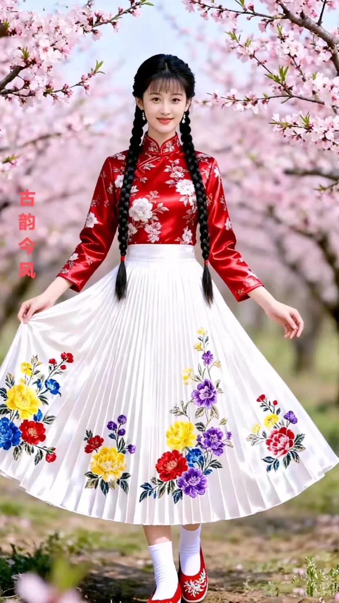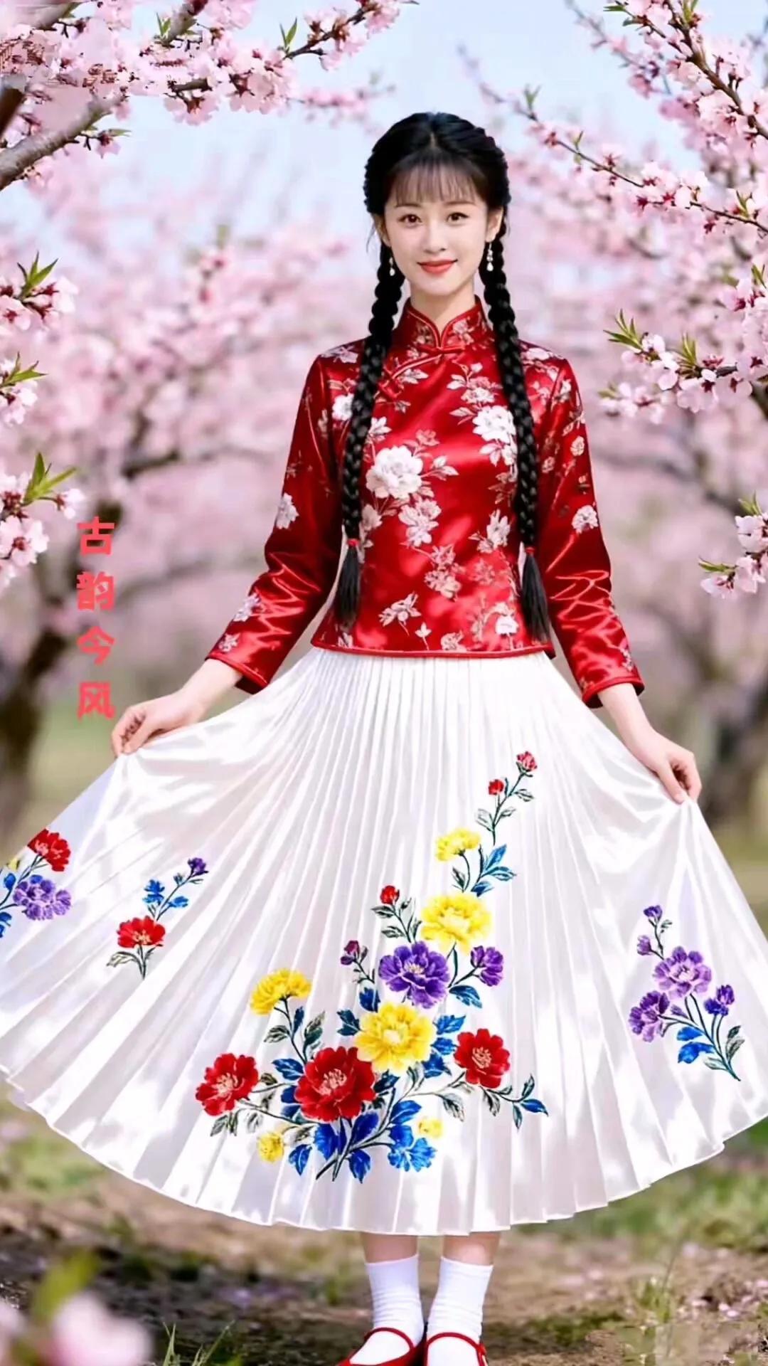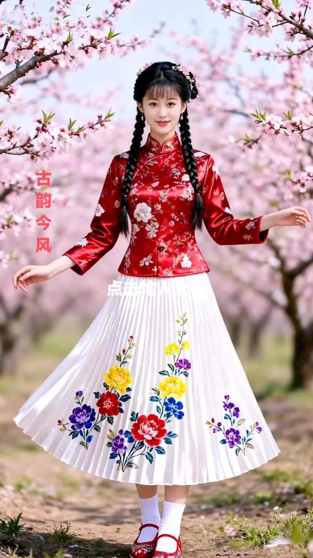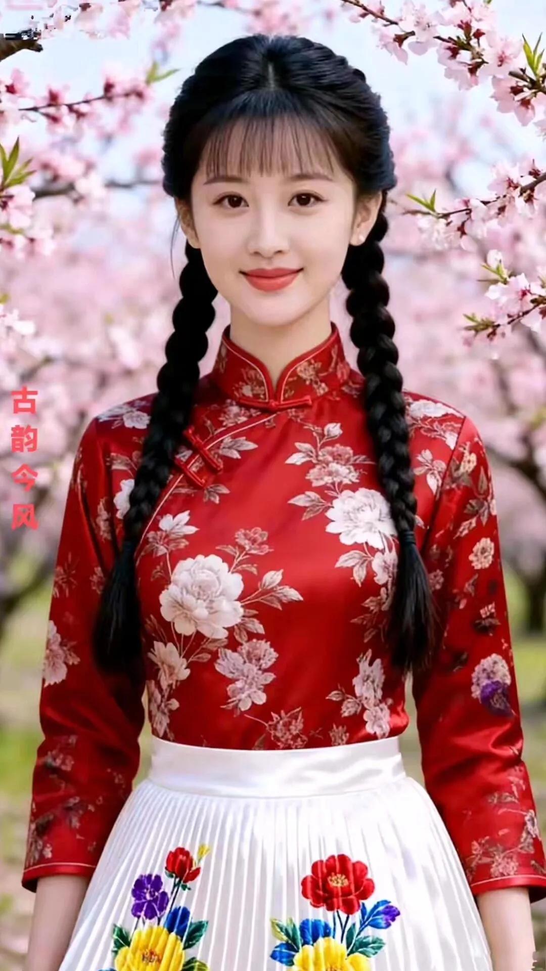 古韵今风,花间美人,红衣飘逸,春意盎然。