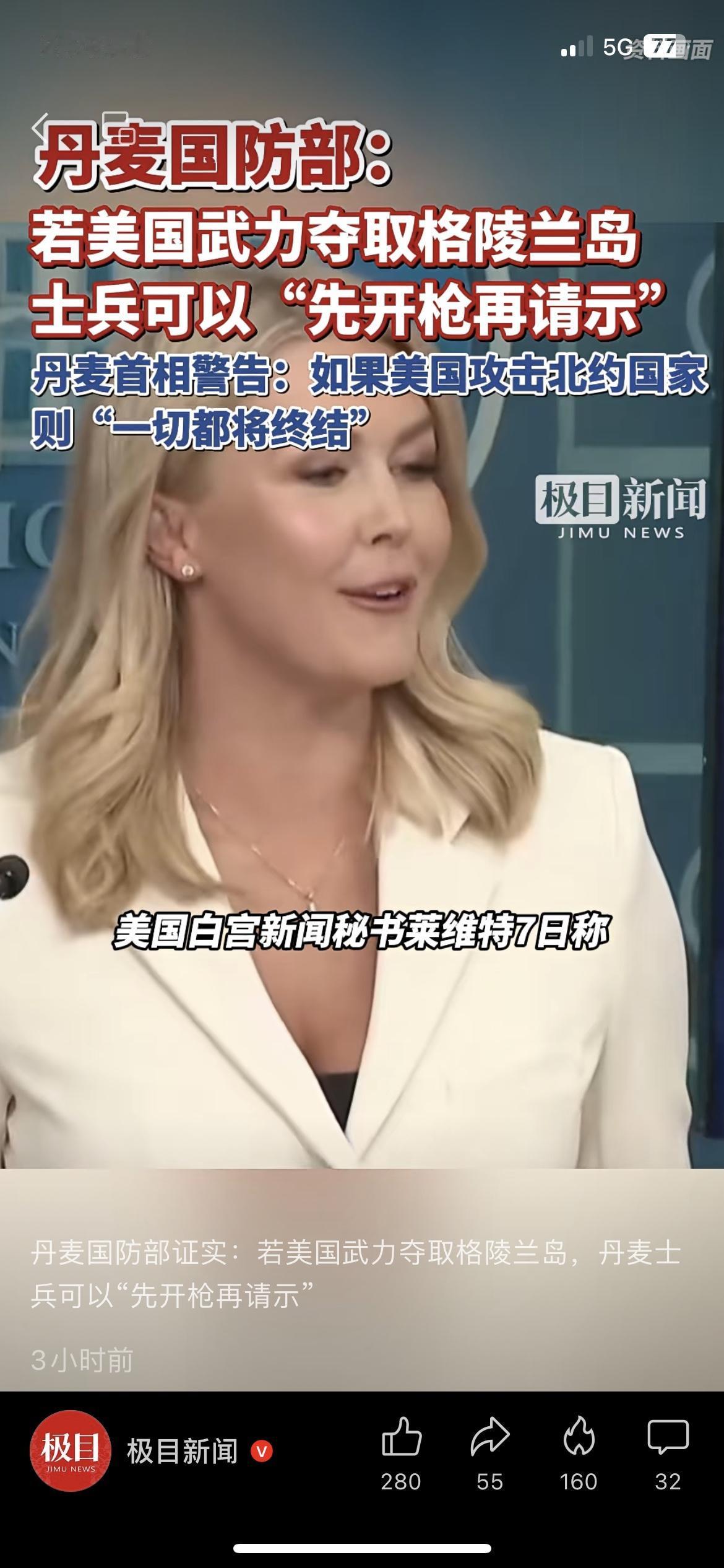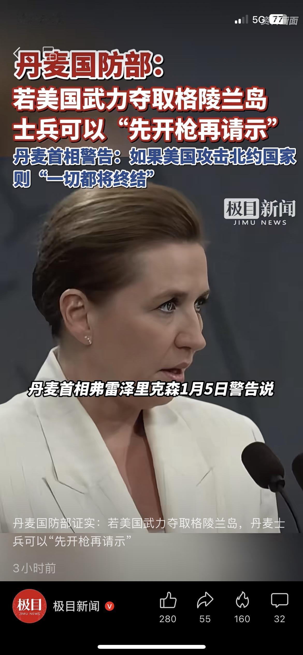 美国想抢格陵兰岛 丹麦放话:敢来就开枪 国际局势 美国又盯上格陵兰岛了,没想到丹麦国防部直接硬气回怼:敢来抢,先开枪再请示! 丹麦首相更是放狠话:美国要是敢打北约盟友的主意,“一切合作都将终结”。 在北欧留学的朋友说,当地超市里格陵兰岛产的鳕鱼突然卖断货,居民都在议论这事,生怕哪天战火烧过来。 白宫还嘴硬说“保留所有选项”,结果遭7个欧洲国家联合反对。 你觉得美国真的会对格陵兰岛动手吗?你咋看北约盟友之间闹掰这事儿?美国占格陵兰岛