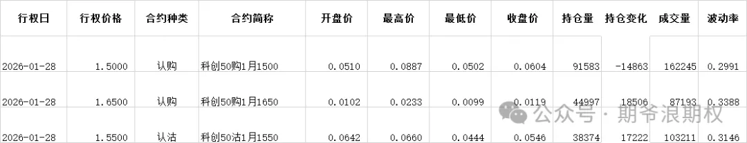 (2)科创50ETF:1月最大持仓范围1400-1500,今收1.531,上涨0.72%。期权1月主力合约,认购和认沽都是低行权价减仓高行权价增仓。认购减仓集中在1300-1500,合计2.9W张,增仓主要集中在1650-1700,合计2.7W张;认沽减仓较少,增仓集中在1450-1650,合计3.9W张。变化超过1W张的仓位如下: