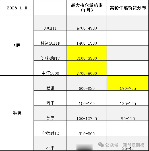 下图是今天大A的3个ETF和中证1000,以及港股的腾讯、阿里、美团、宁德和小米的最大持仓量范围以及窝轮牛熊分布范围,也就是1月的期权筹码分布,黄色的表示跟上个交易日有变动。