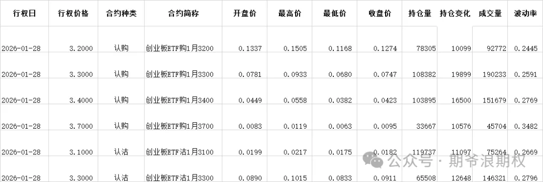 (3)创业板ETF期权:12月最大持仓范围3100-3300,今收3.287,下跌0.72%。期权1月合约,认购和认沽全部都是增仓。认购增仓集中在3100-3700,合计7.4W张;认沽以增仓为主,集中在2800-3500,合计4.7W张。变化超过1W张的仓位如下: